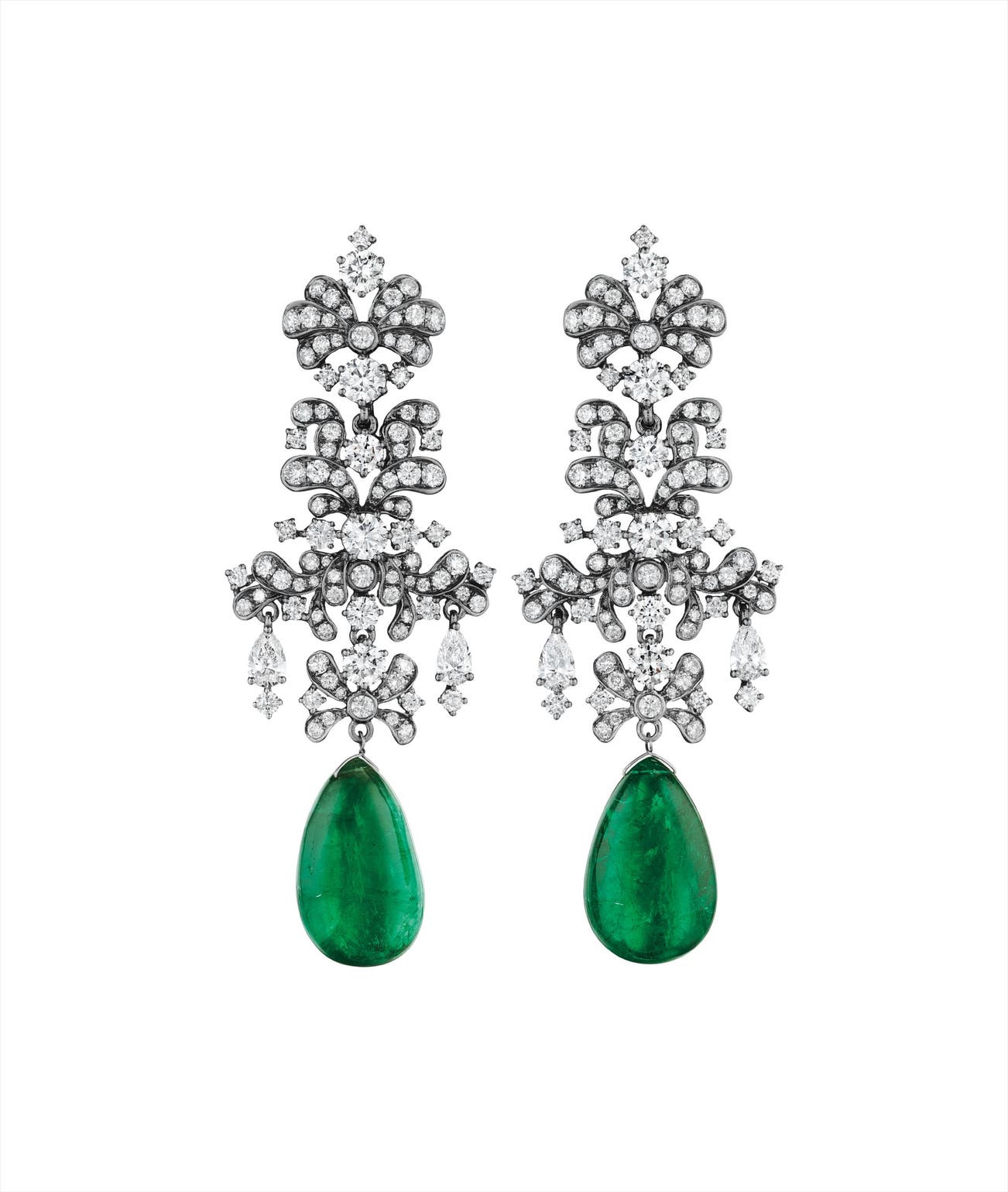 Of chandelier design, each suspending a pear-shaped emerald drop, weighingapproximately 26.88 carats in total,from an articulated bow and foliate motif plaque, entirely set with circular-cut and pear-shaped diamonds, mounted in 18K white gold, length 2 1/2 inches.