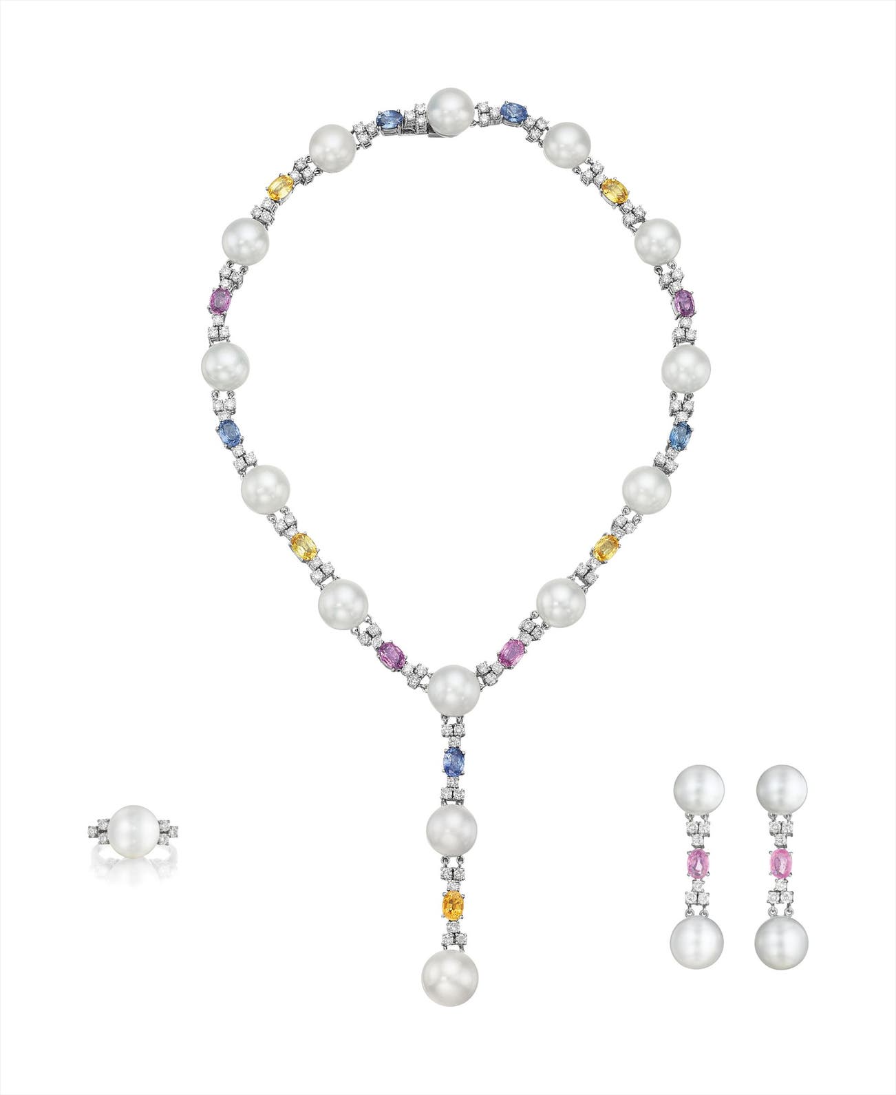 Comprising a necklace, designed as a series of cultured pearls, interspersed by circular-cut diamond clusters and oval-shaped multi-color sapphires, suspending a similarly designed line; a pair of similarly designed ear pendants and ring en suite, mounted in 18K white gold, necklace length 21 inches, ear pendant length 1 3/4 inches, ring size 6 3/4.