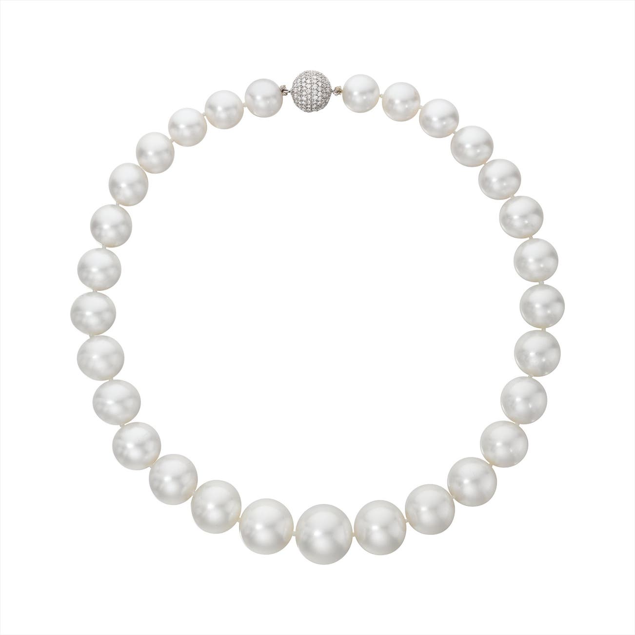 Of twenty-nine cultured pearls, measuring from approximately 12.09 to 17.35 mm, joined by a pavé-set diamond clasp, mounted in 18K white gold, length 17 inches.