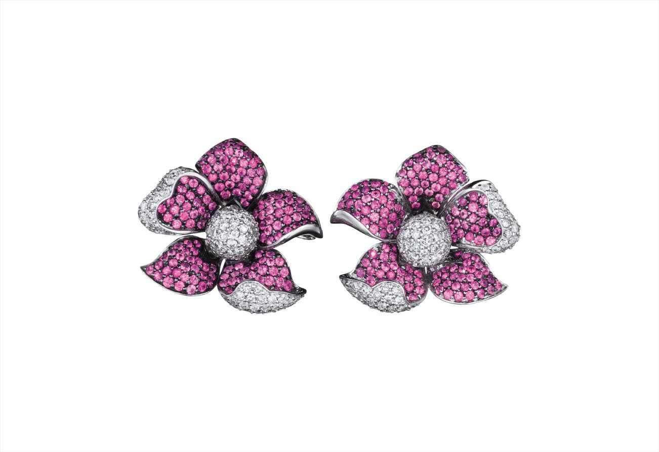 Each designed as a sculpted flower decorated with circular-cut pink sapphires, centering on a pavé-set diamond cluster, mounted in 18K white gold, length 1 1/8 inches.