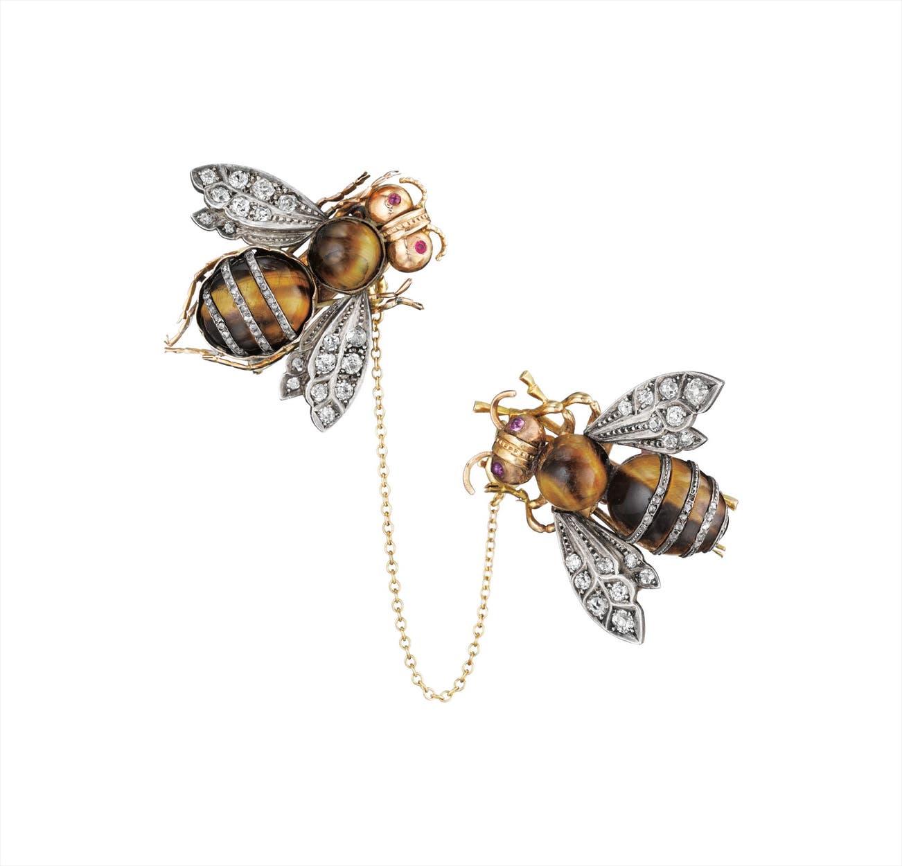A Pair of Tiger's Eye, Diamond and Ruby 'Bee' Clips