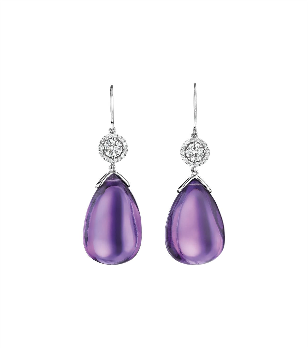 Each designed as an amethyst drop, weighing approximately 40.62 carats in total, from a circular-cut diamond spacer within a pavé-set diamond surround, mounted in 18K white gold, length 1 3/4 inches.