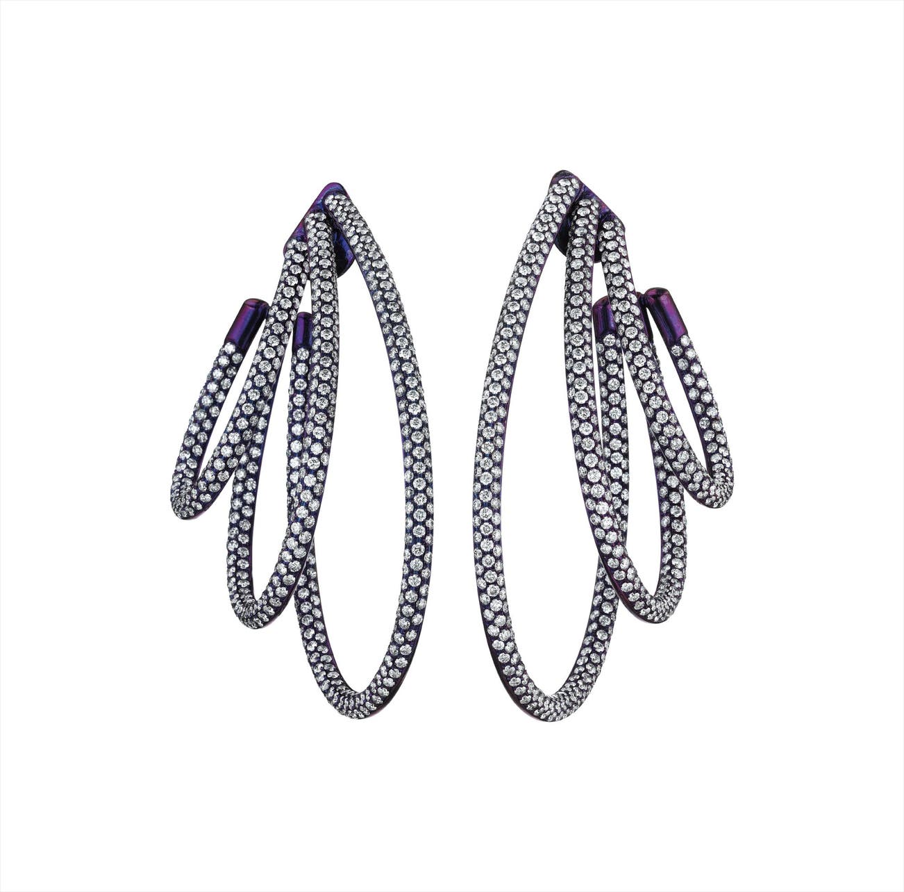 Each designed as a three row graduated pavé-set diamond hoop, mounted in titanium and 18K white gold, length 2 3/4 inches.