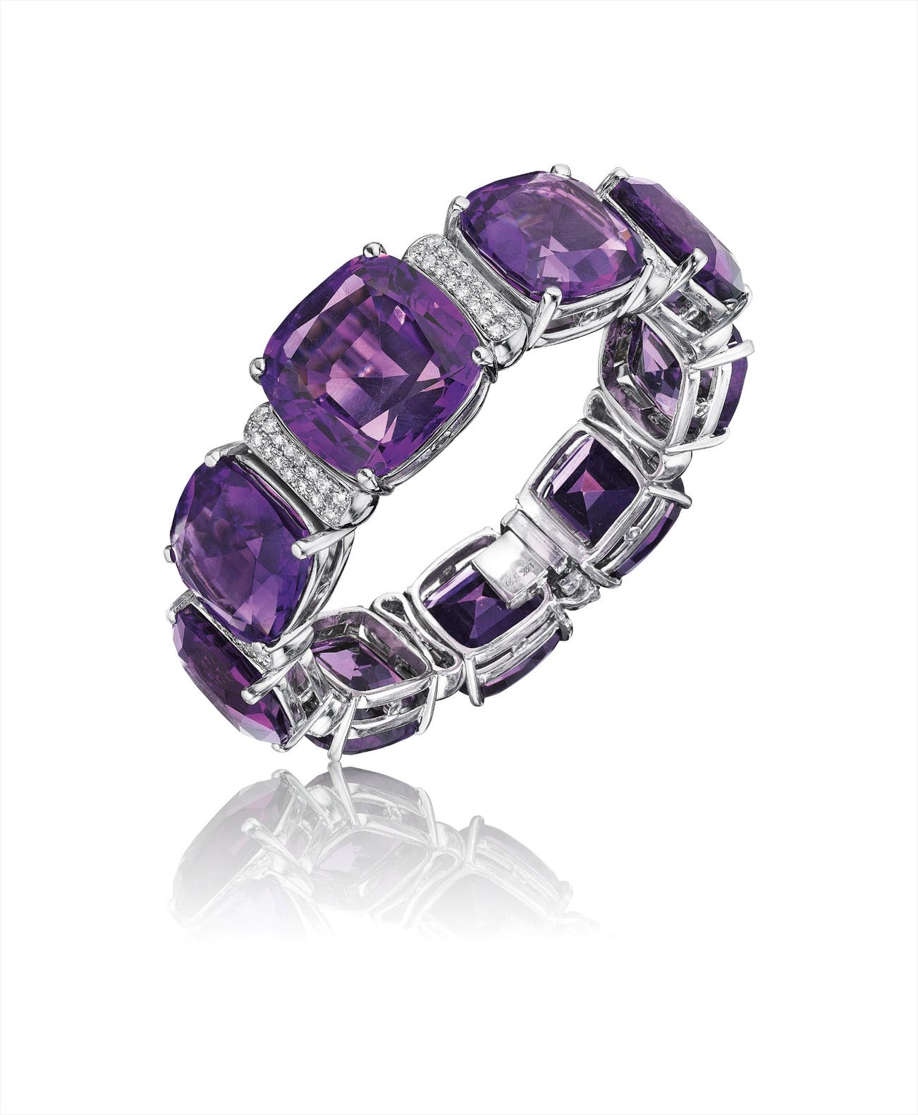 Designed as a series of alternating cushion-cut amethysts, weighing approximately 206.62 carats total, and pavé-set circular-cut diamond spacers, mounted in 18K white gold, length 7 1/2 inches.