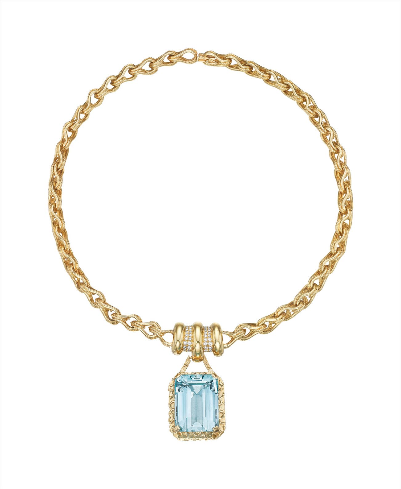Suspending a rectangular-cut aquamarine, weighing approximately 37.50 carats, within a textured gold frame, to the pavé-set diamond link and fancy-link chain, mounted in 14K yellow gold, length 16 inches.