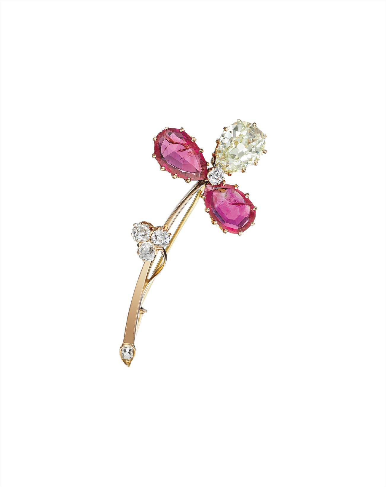 Designed as a three petal flower brooch, set with two pear-shaped pink sapphires and a pear-shaped diamond, to the polished gold stem and old-cut diamond cluster, mounted in 14K yellow gold, length 1 3/4 inches.
