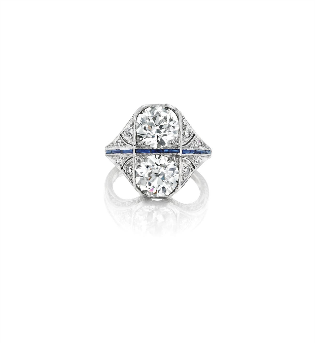 Designed as a row of two old-cut diamonds, weighing approximately 3.19 carats in total, within a pierced openwork surround, accented with old-cut diamonds and calibré-cut sapphires, mounted in platinum, size 4 3/4.