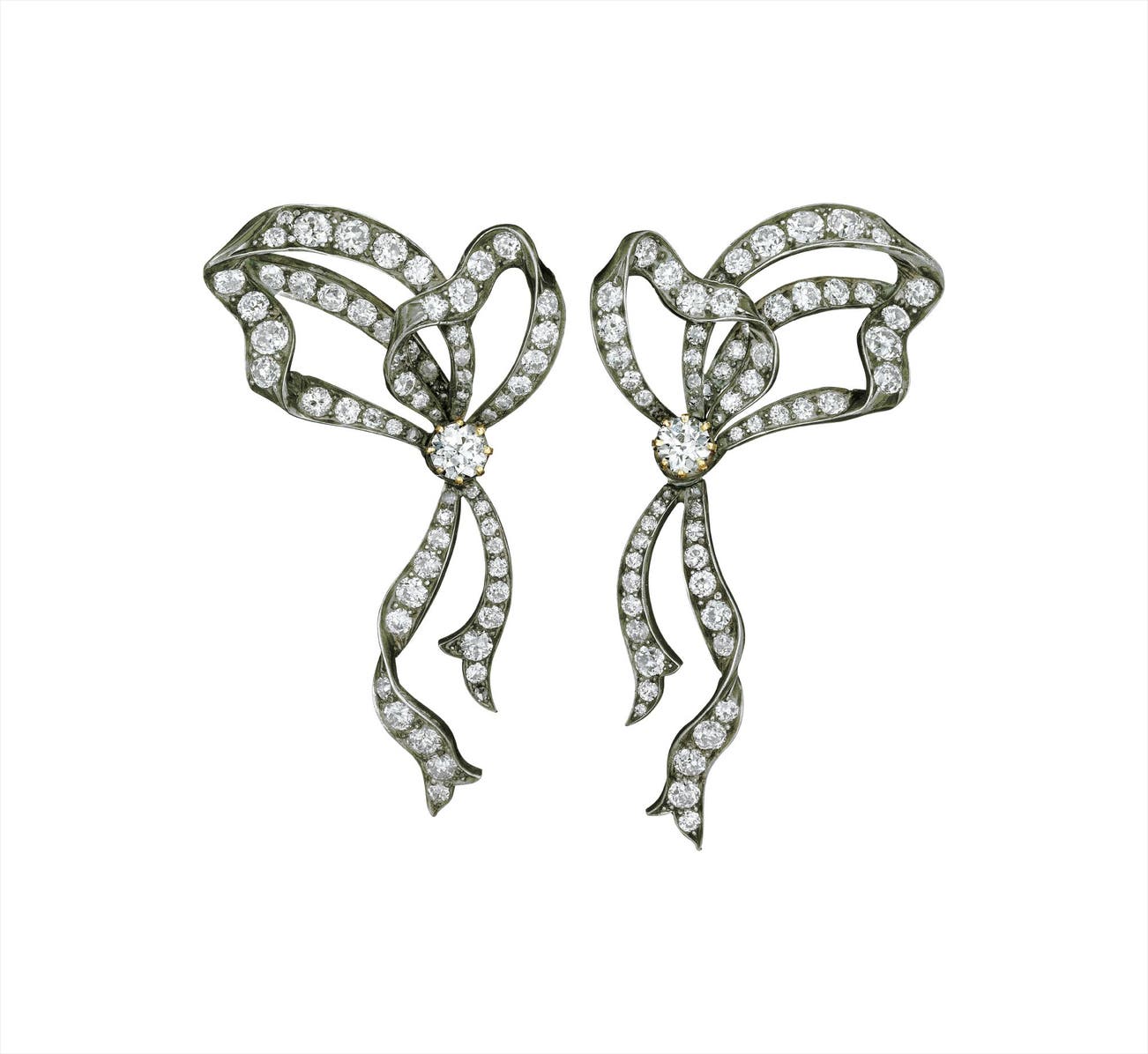 Each designed as an articulated old-cut diamond bow, centering upon an old-cut diamond, mounted in silver-topped gold, length 2 1/2 inches.