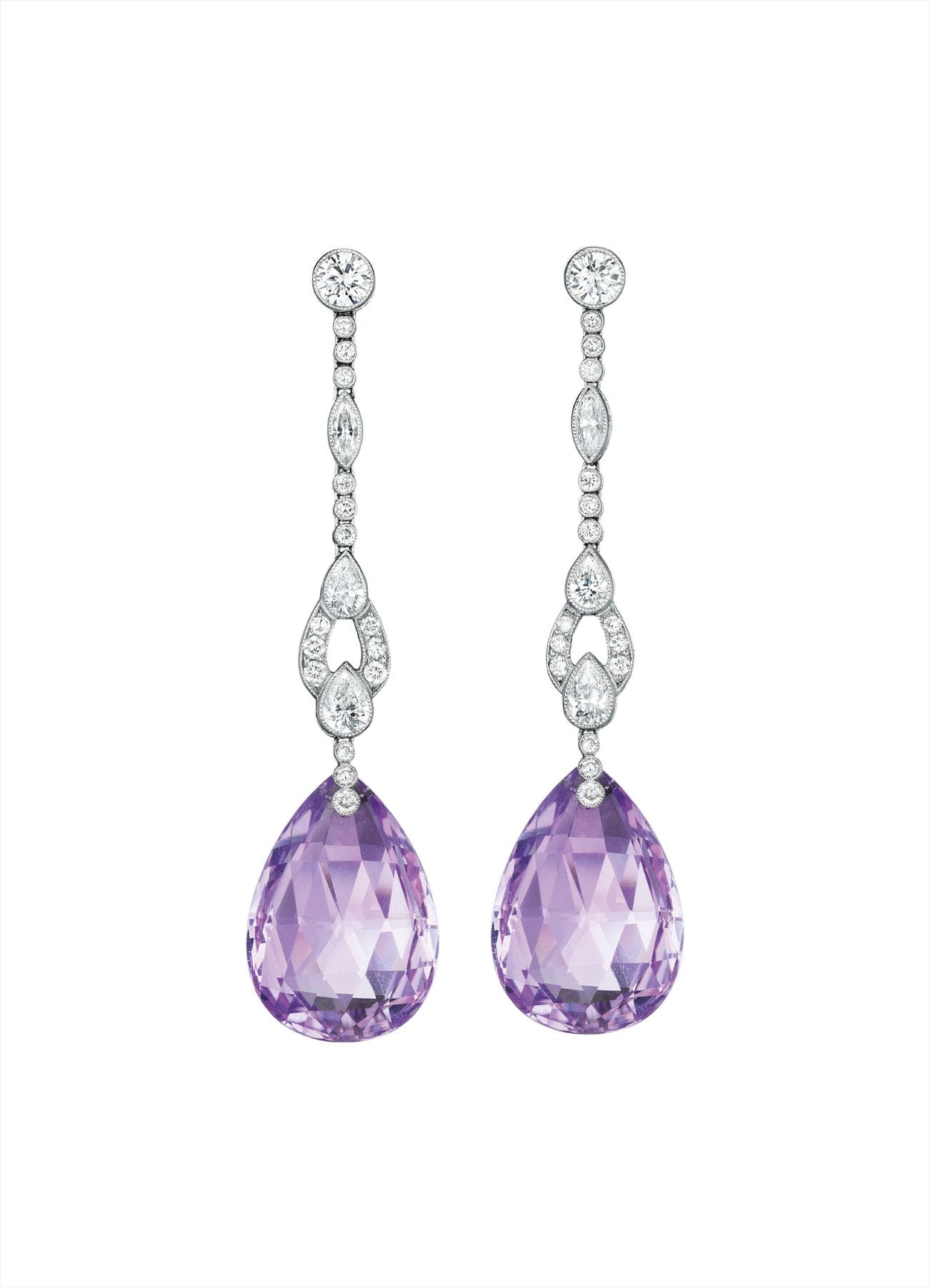 Each suspending a pear-shaped faceted amethyst, from a collet-set diamond fancy link, to a line of pear-shaped and circular-cut collet-set diamonds and surmount, mounted in platinum, length 2 1/2 inches.