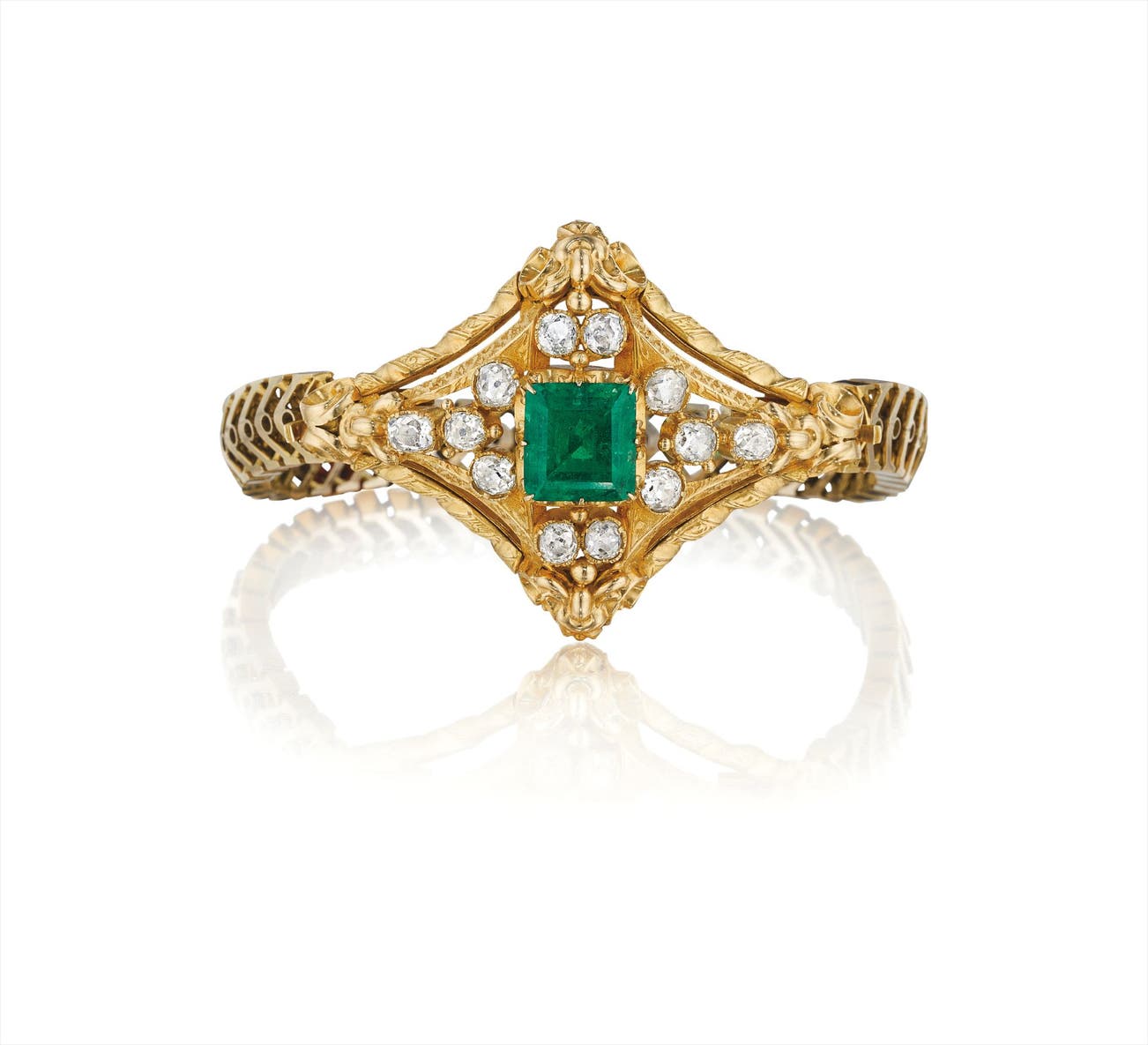 Designed as an engraved openwork plaque, set to the center with a square-cut emerald, accented by old-cut diamonds, to the flexible gold detachable band, mounted in 18K yellow gold, diameter 2 inches.