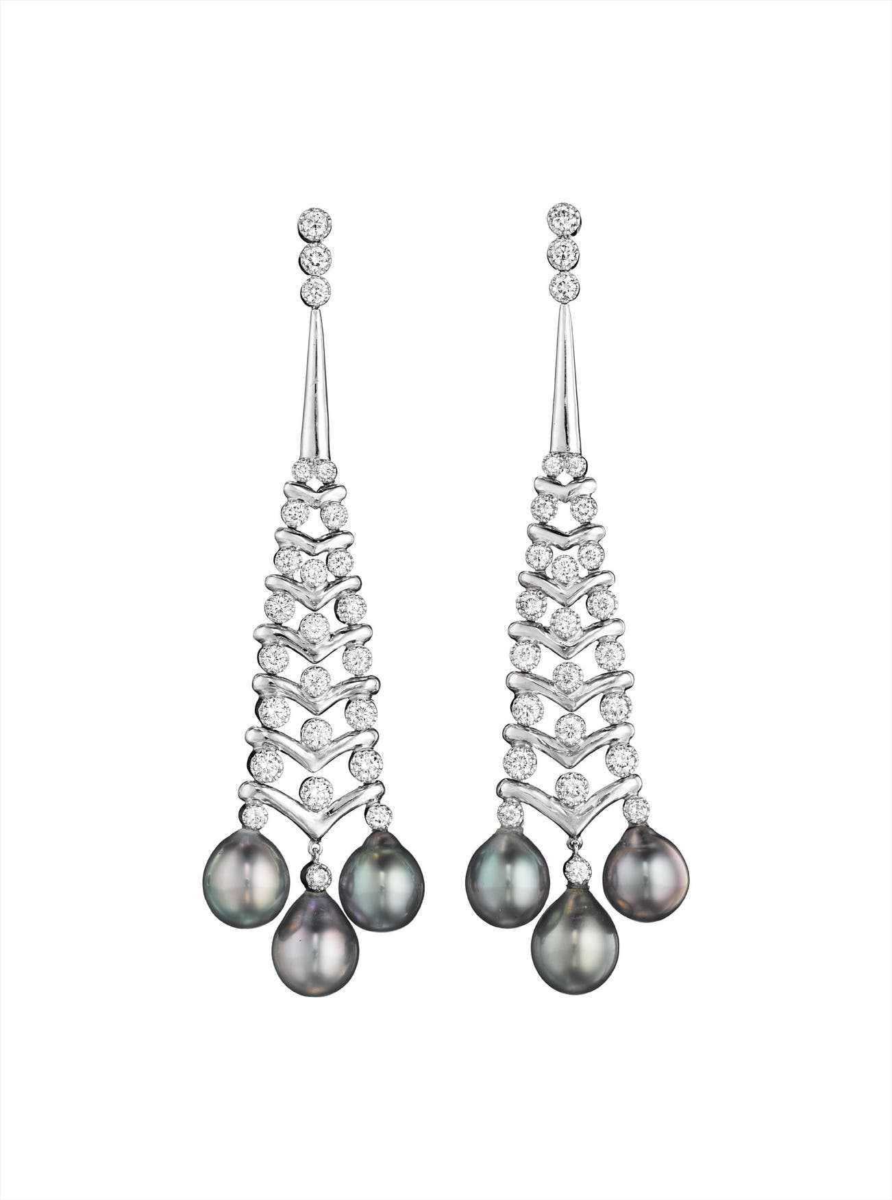 Each designed as a tapered flexible drop, accented by collet-set circular-cut diamonds, to the cultured pearl tassel terminals, mounted in 14K white gold, length 3 inches.