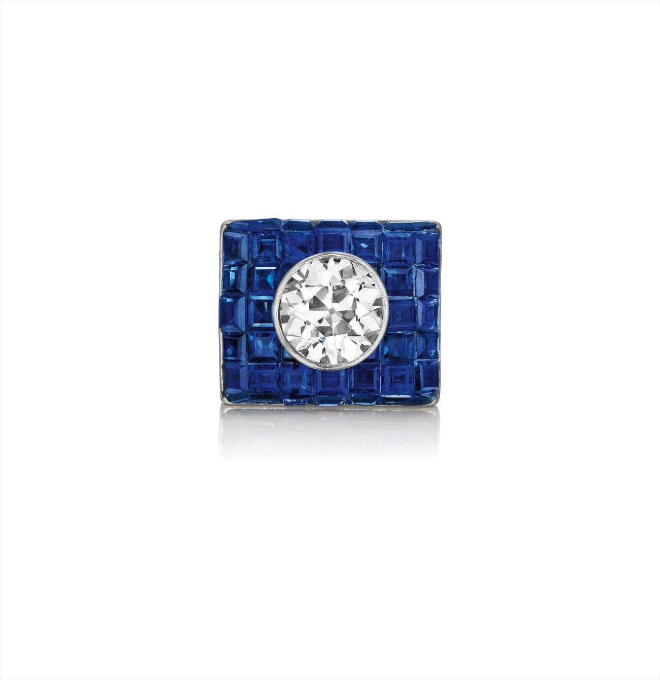 Set with an old-cut diamond, weighing approximately 3.50 carats, within an invisibly-set sapphire frame, mounted in platinum, size 6 1/4.