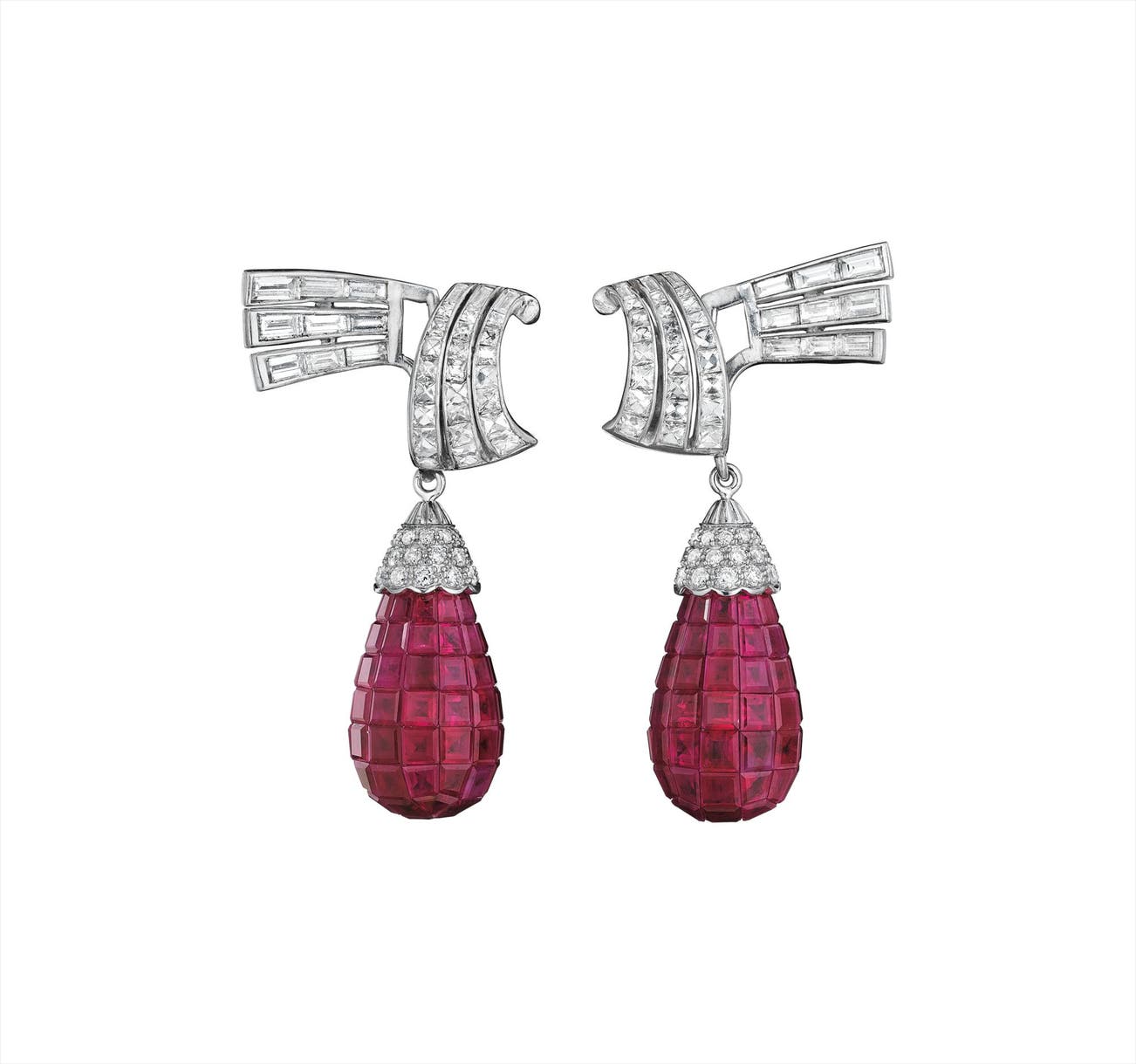 Each designed as a baguette and square-cut diamond spray surmount, suspending a detachable calibré-cut ruby drop from a pavé-set diamond cap, mounted in 18K and 14K white gold, length 2 inches.