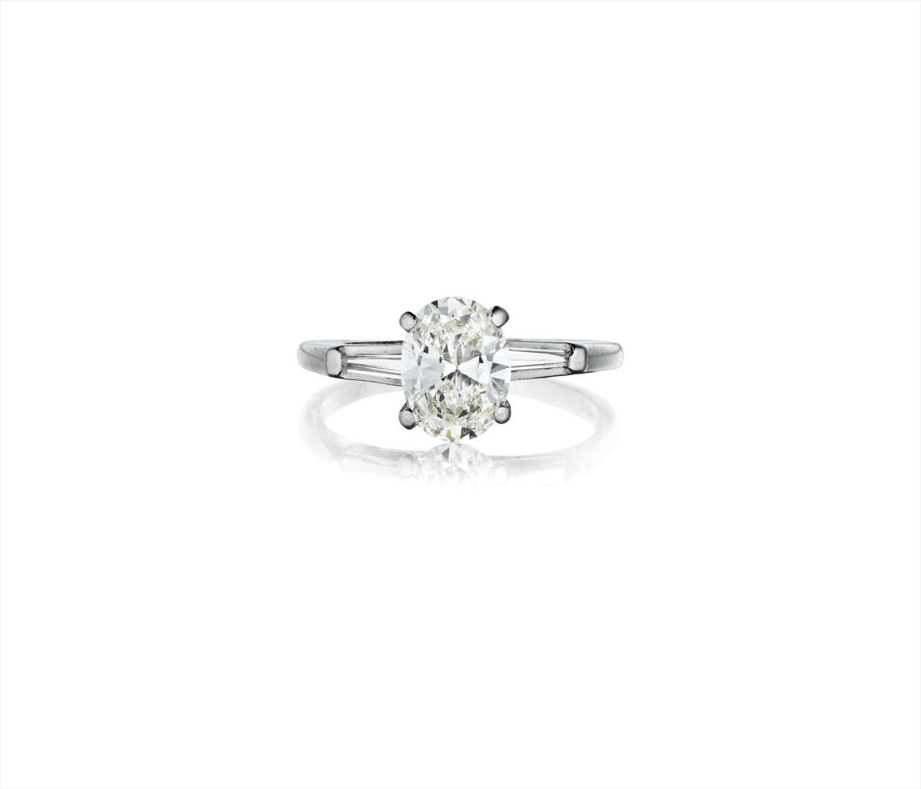 Set with an oval-cut diamond, weighing approximately 1.58 carats, flanked on either side by a tapered baguette-cut diamond, to the plain hoop, mounted in platinum, size 8.