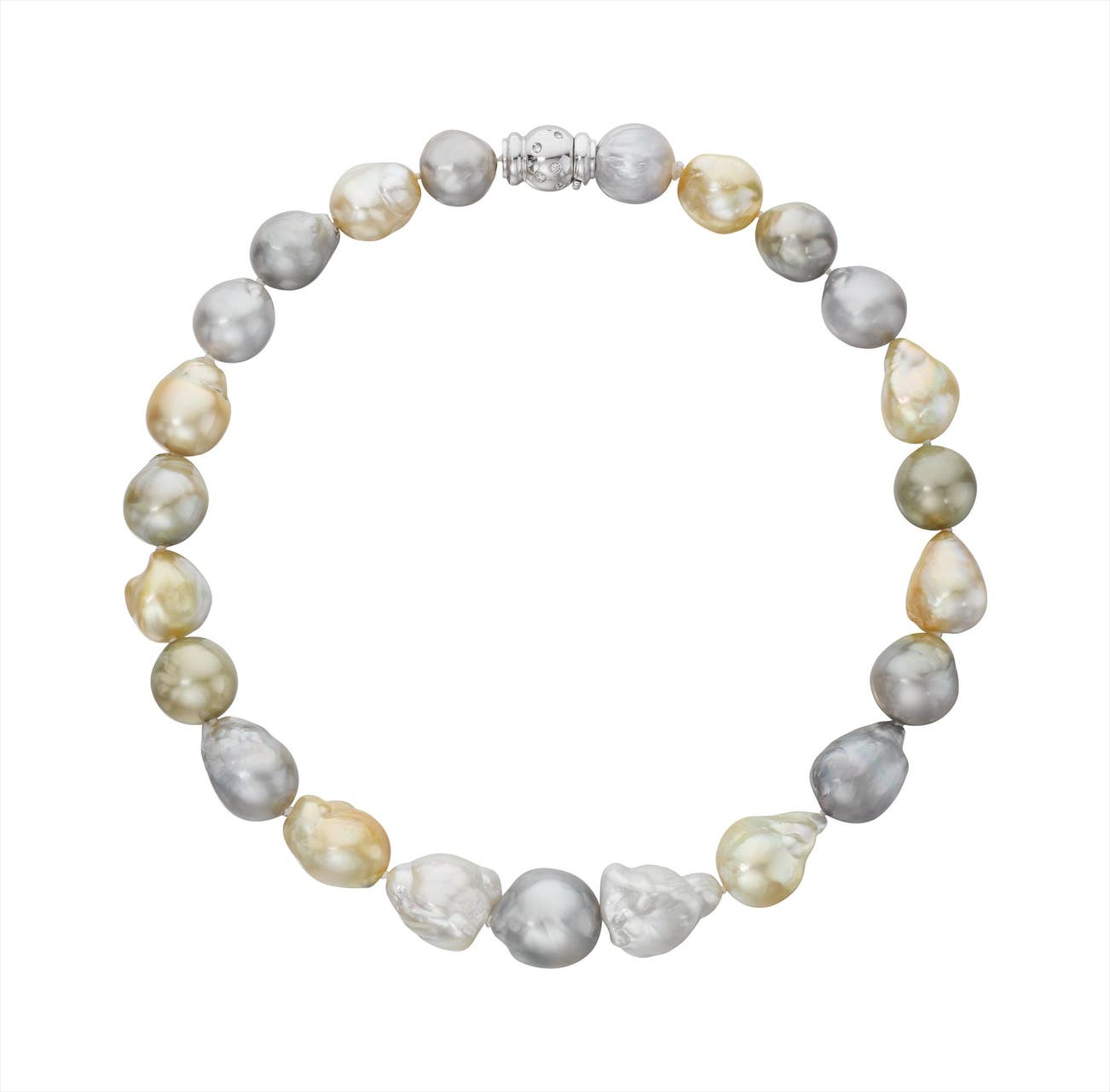 Of twenty-three multi-color baroque cultured pearls, measuring from approximately 16.20 to 12.59 mm, joined by a polished gold clasp accented with circular-cut diamonds, mounted in 18K white gold, length 17 inches.