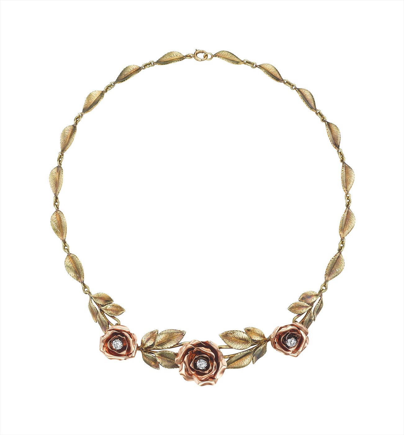 Comprising three sculpted roses, each centering on a circular-cut diamond, to the leaf motif backchain, mounted in 14K rose and green gold, necklace length 15 1/2 inches.