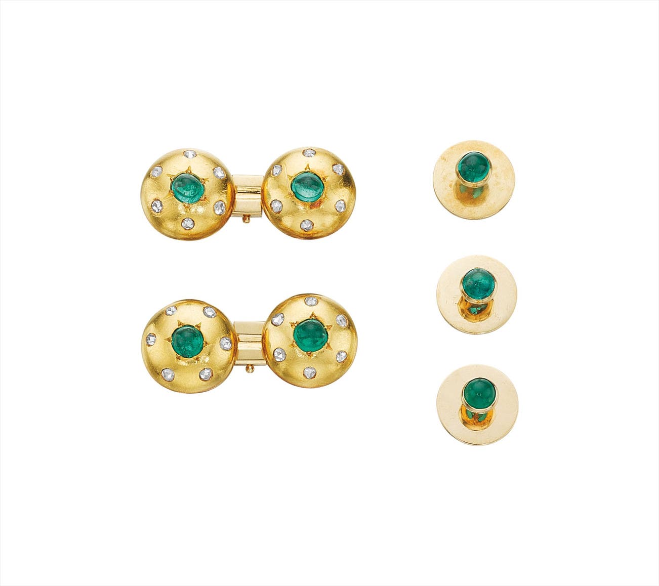 Comprising a pair of cufflinks, each double link centering on a round cabochon emerald, accented by rose-cut diamonds; and three dress shirt studs en suite, mounted in 18K yellow gold, cufflinks length 1 1/8 inch, shirt studs length 1/4 inch.