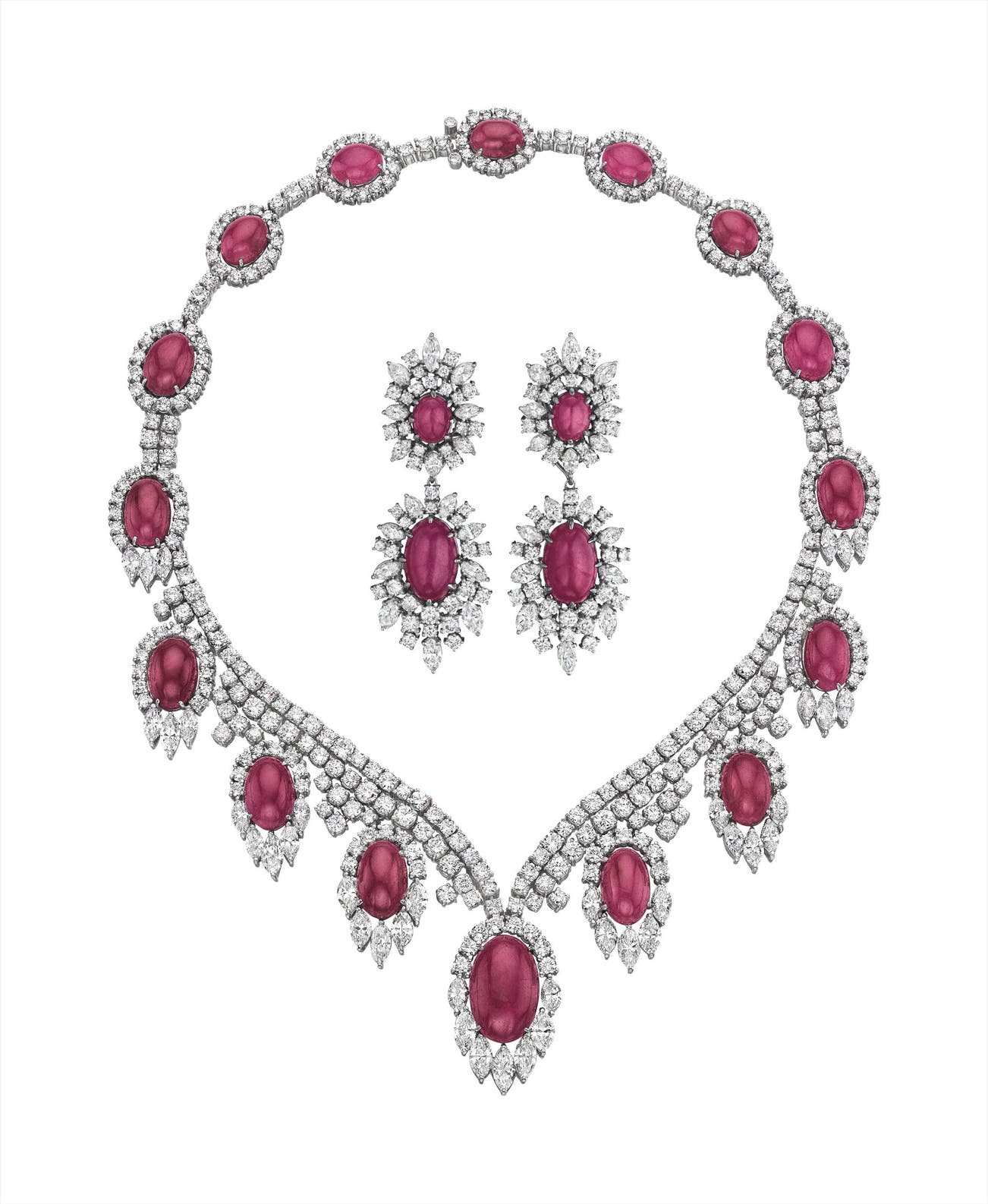 Comprising a necklace designed as a graduated fringe of circular-cut diamonds and cabochon rubies within a circular and marquise-cut diamond surround; a pair of similarly designed ear pendants en suite, mounted in platinum, necklace length 16 1/2 inches, earclips length 2 1/2 inches.