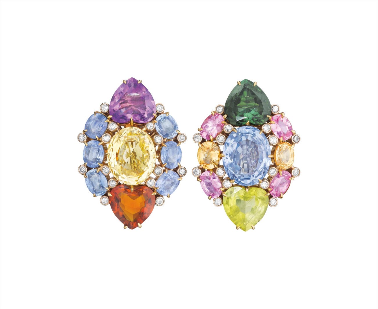 Each centering on an oval-cut sapphire and yellow sapphire, weighing approximately 25.72 carats in total, extending a heart-shaped tourmaline and amethyst, accented by collet-set circular-cut diamonds and oval-shaped multi-color sapphires, mounted in 18K yellow gold, length 1 1/2 inches.