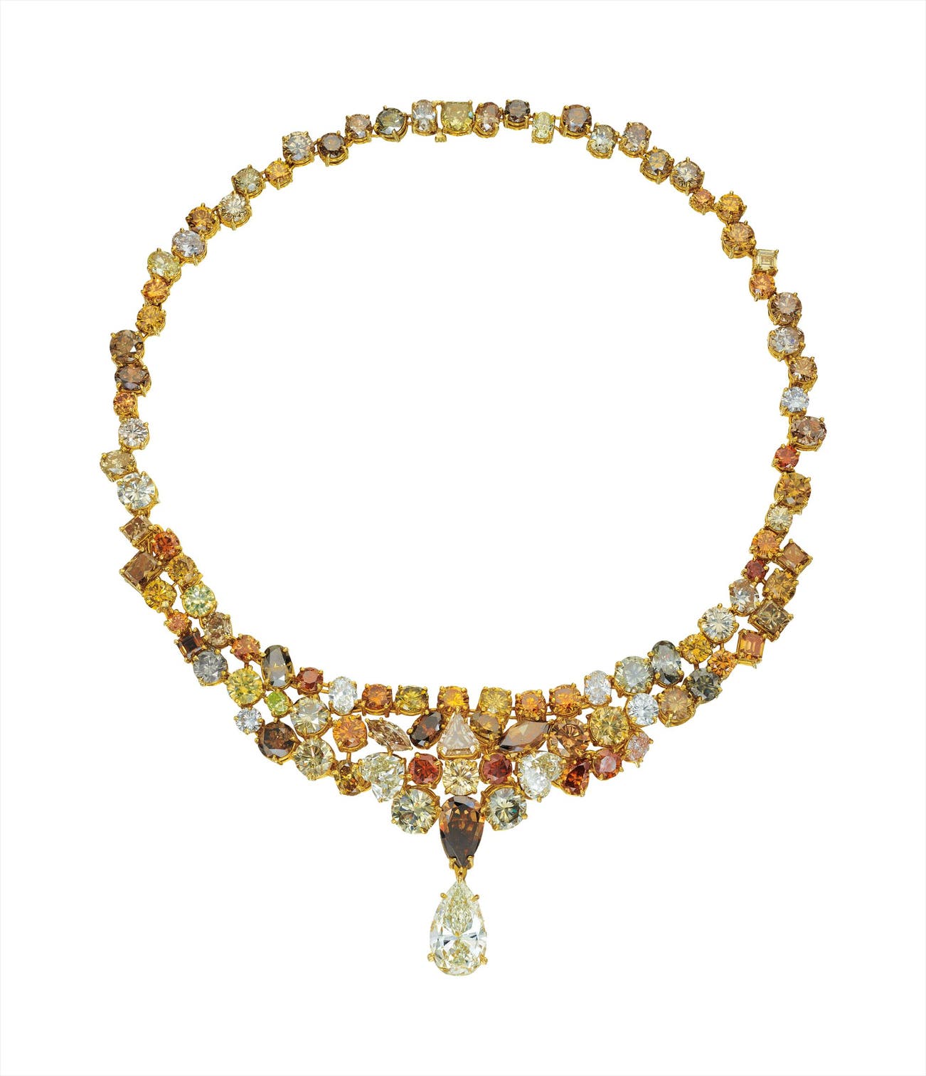 The flexible collar designed as a graduating panel of vari-cut fancy colored diamonds, weighing approximately 117.42 carats in total,suspending a larger pear-shaped colored diamond, weighing approximately 8.50 carats,to the tapering back chain of similar design, mounted in 18K yellow gold, length 18 inches.