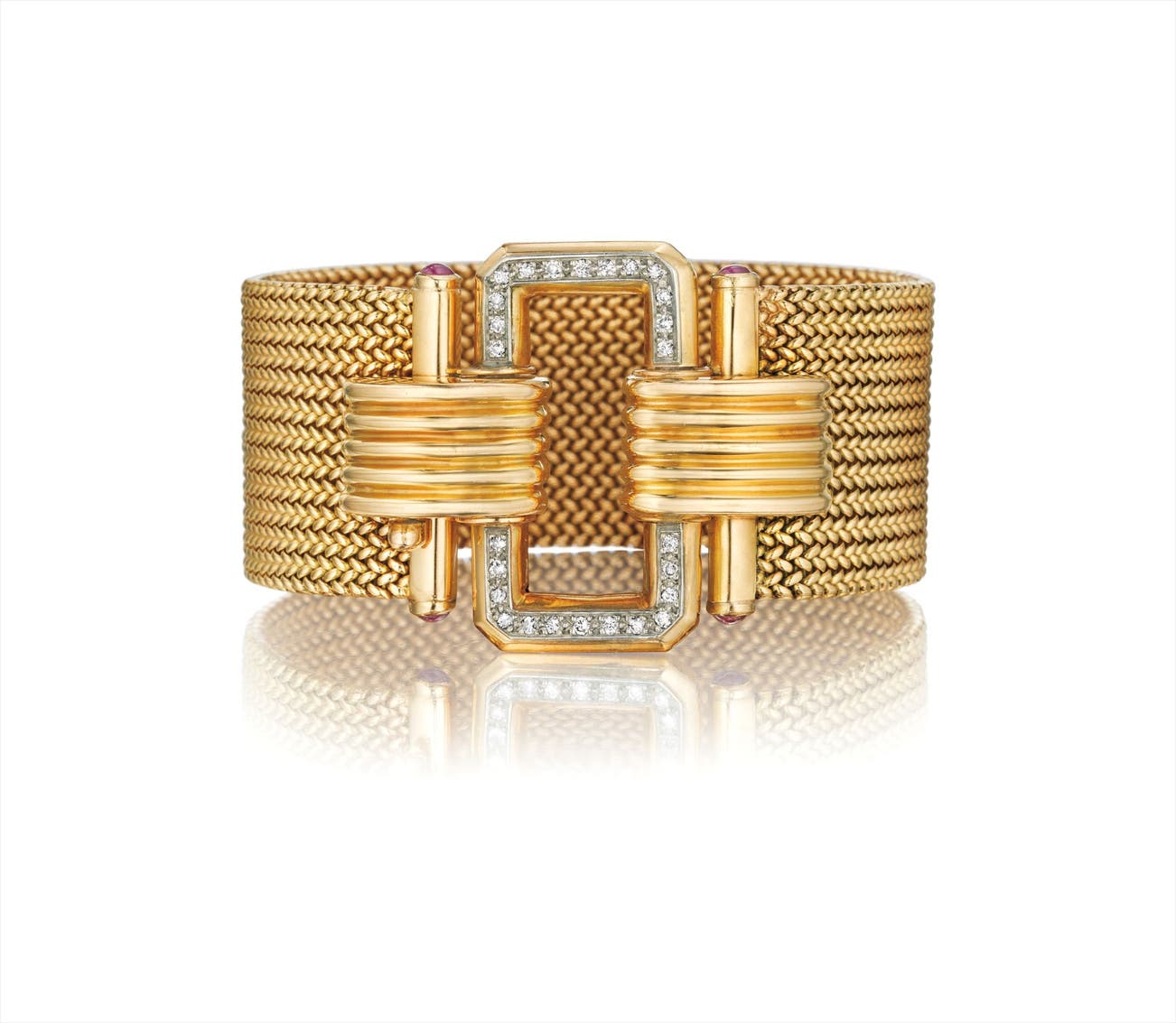 Designed as a highly flexible mesh bracelet, joined by a polished gold clasp, accented by circular-cut diamonds and cabochon ruby terminals, mounted in 18K yellow gold, length 7 inches.