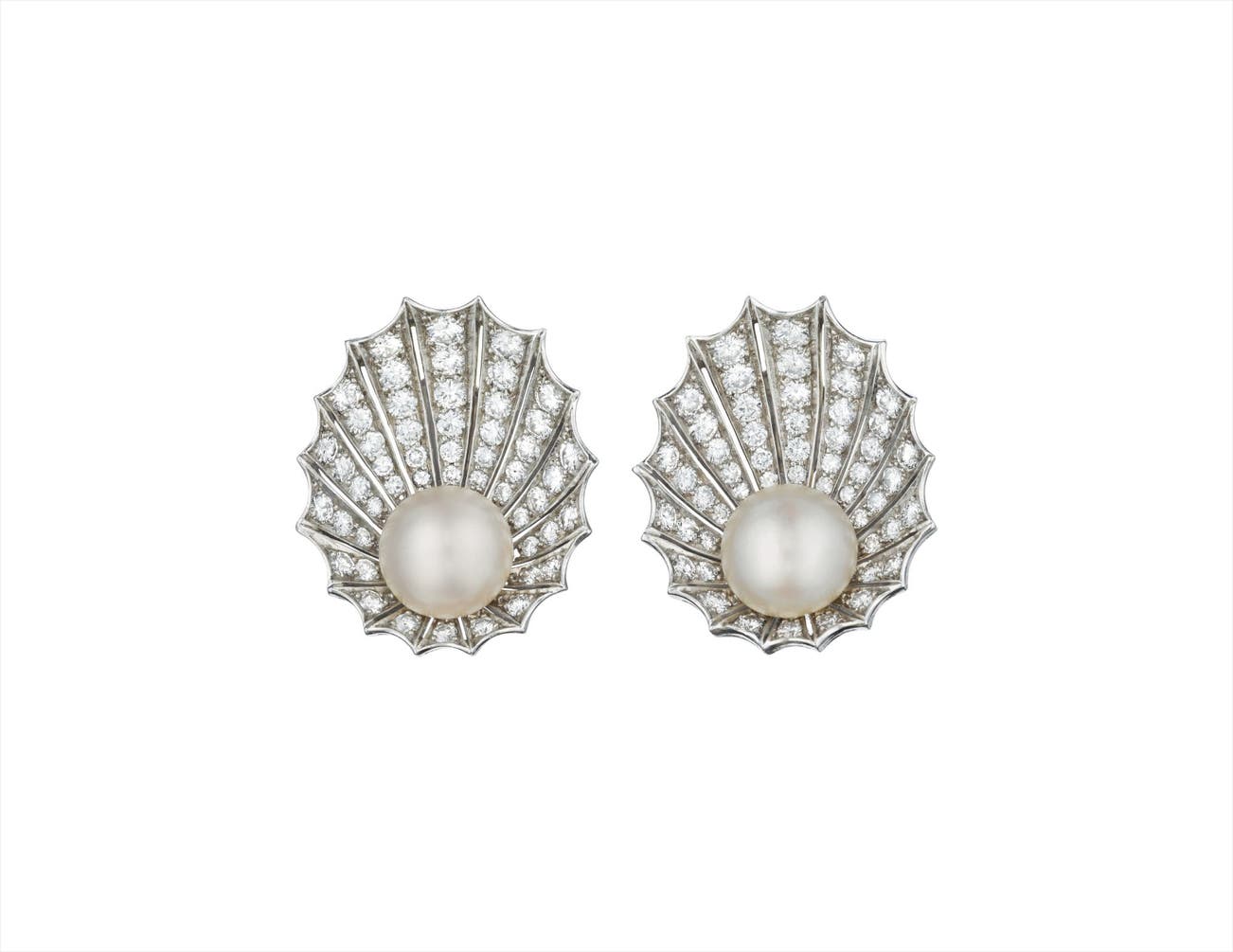 Each designed as a sculpted shell set with circular-cut diamonds, centering upon a cultured pearl, mounted in platinum, length 1 inch.