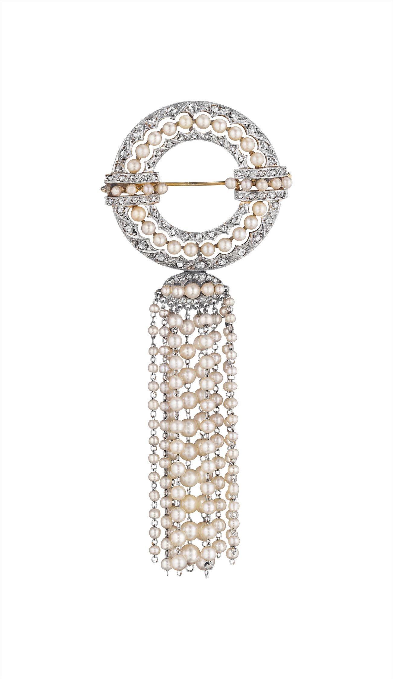 Designed as a circular openwork disc, accented by seed pearl and rose-cut diamonds, suspending seed pearl tassel terminals, mounted in 14K white and yellow gold, length 3 1/2 inches.