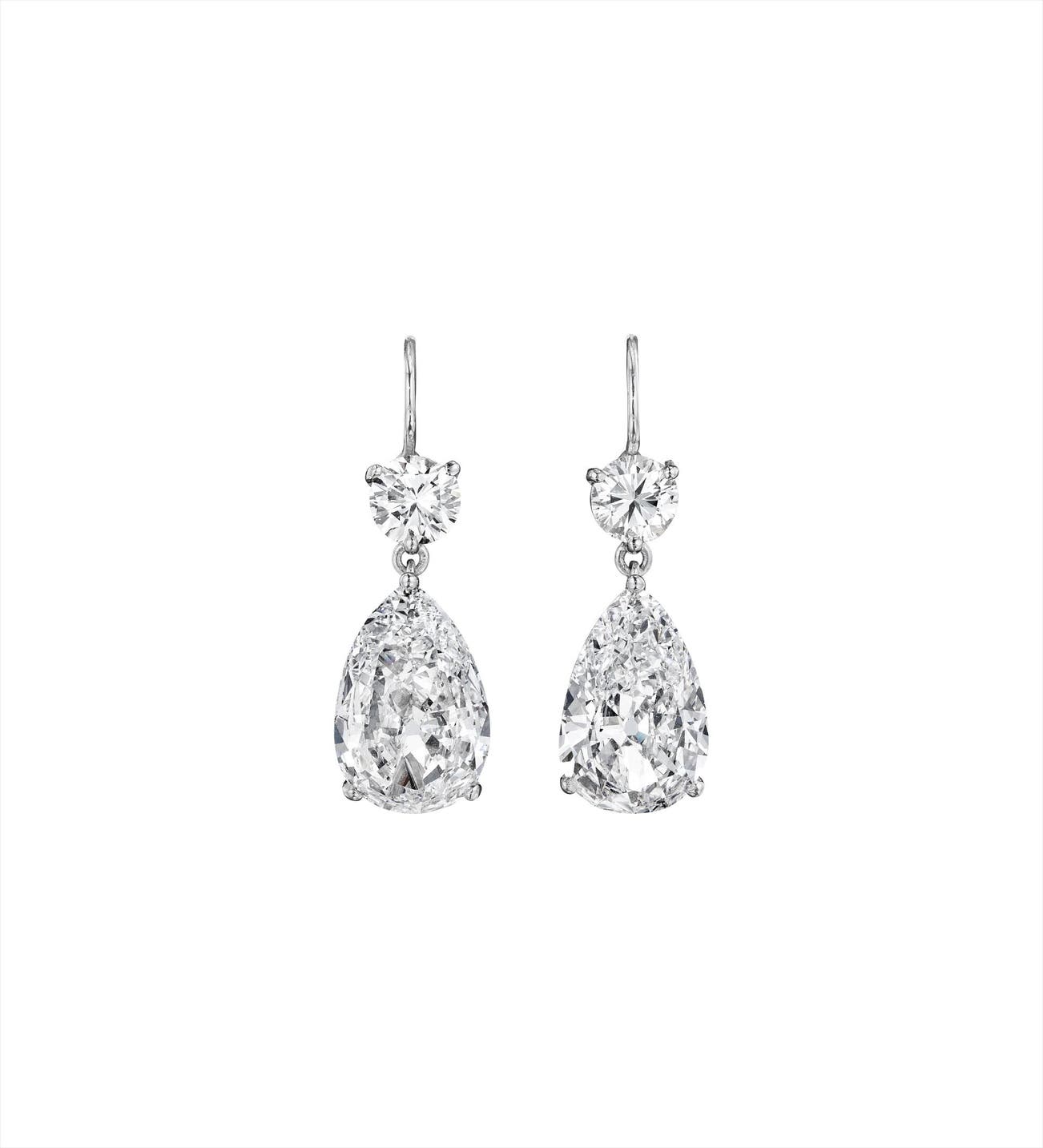 Each suspending a pear-shaped diamond, weighing approximately 6.58 carats in total, from a circular-cut diamond surmount, mounted in 14K white gold, length 1 inch.