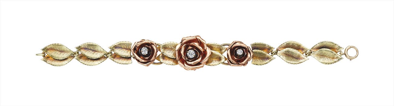 Designed as three sculpted roses, each centering on a circular-cut diamond, to the leaf motif backchain, mounted in 14K rose and green gold, bracelet length 7 inches.