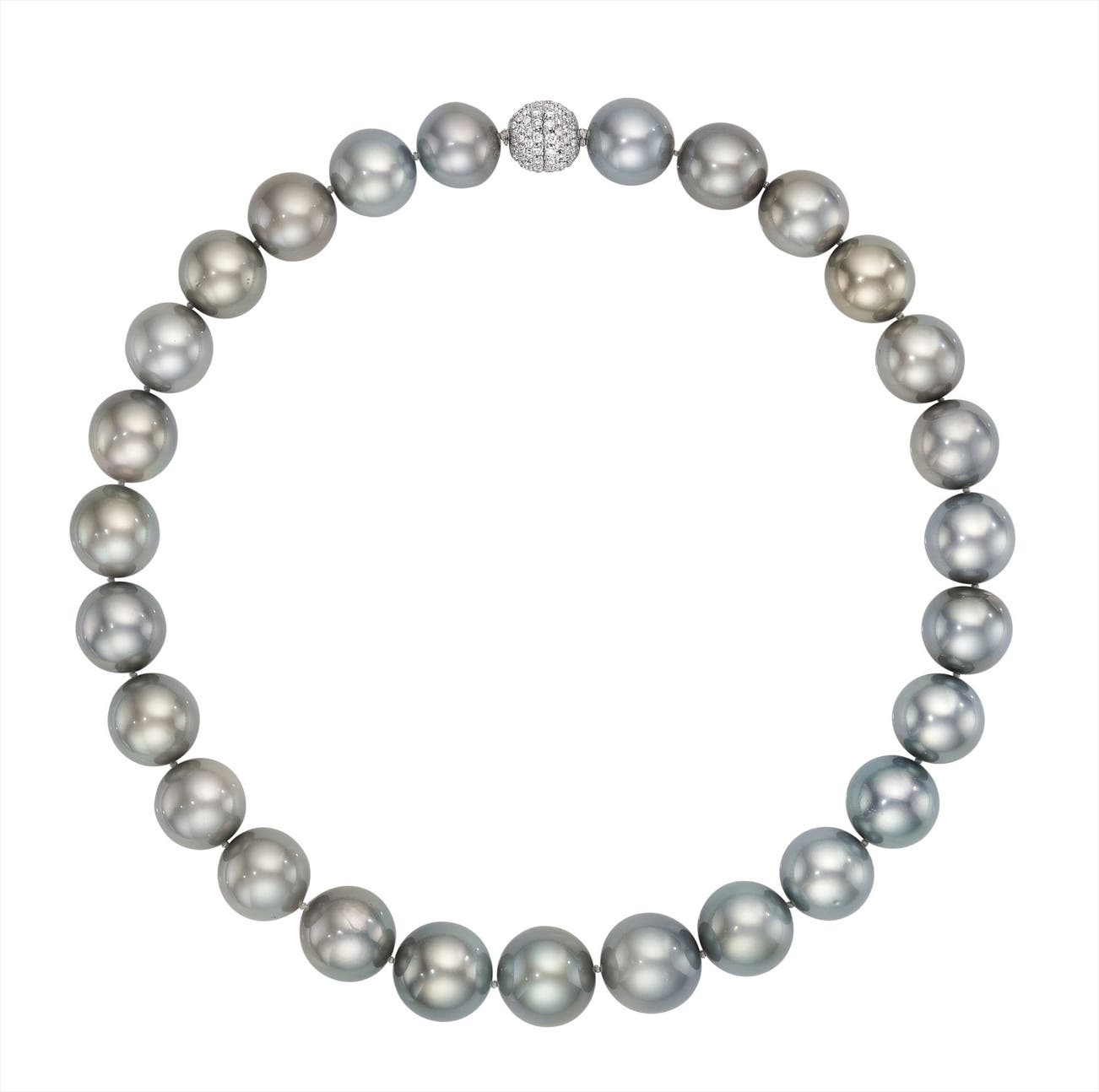 Of twenty-seven South Sea cultured pearls, measuring from approximately 16.00 to 14.00 mm, joined by a pavé-set diamond clasp, mounted in 18K white gold, length 17 inches.