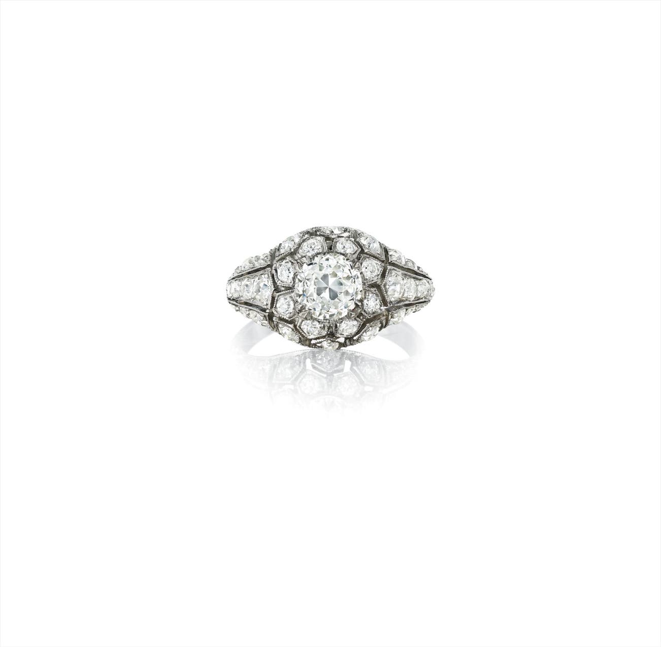 Of bombé design, centering on an old-cut diamond weighing approximately 0.86 carats, within an open-work surround enhanced by pavé-set diamonds, mounted in platinum, size 4 1/4.