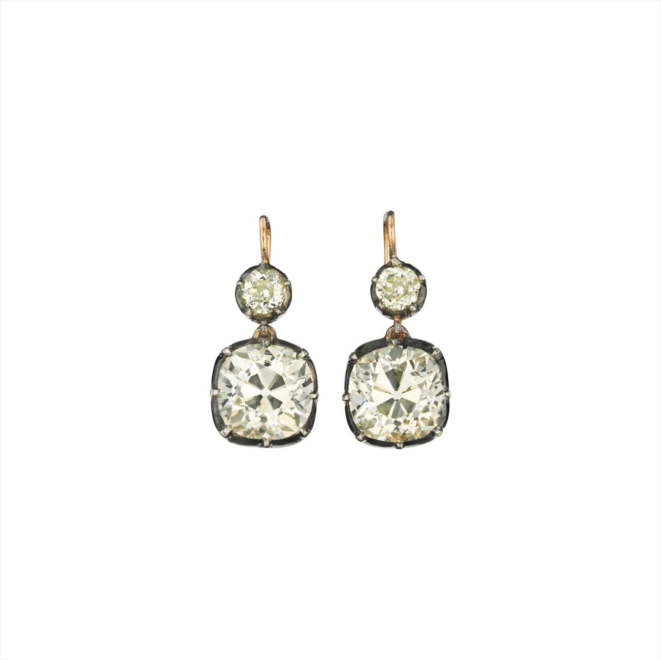 Each suspending a collet-set old-cut diamond, weighing approximately 7.34 carats in total, from a similarly designed surmount, mounted in silver-topped gold, length 3/4 inch.