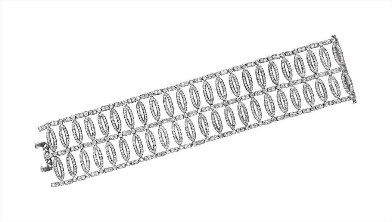 Of wide flexible design, centering on two rows of navette-shaped pavé-set diamond links, framed by two rows of circular-cut diamonds, mounted in 18K white gold, length 7 1/4 inches.