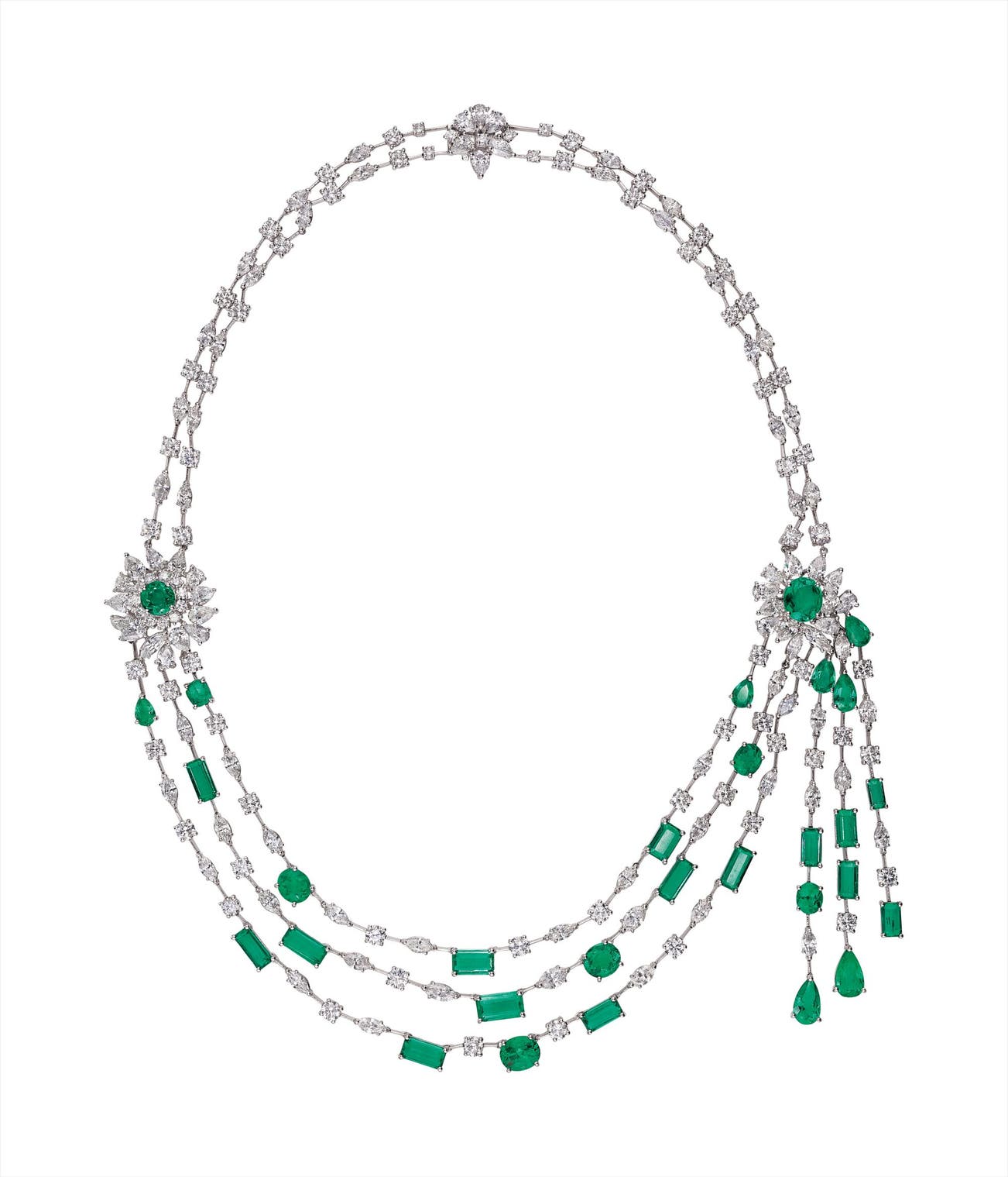 Of asymmetric design, the two vari-cut diamond and emerald flowerhead accent links, joined by three strands of vari-cut diamonds and Colombian emeralds, to the similarly designed double strand diamond back chain and clasp, mounted in 18K white gold, length 19 inches.