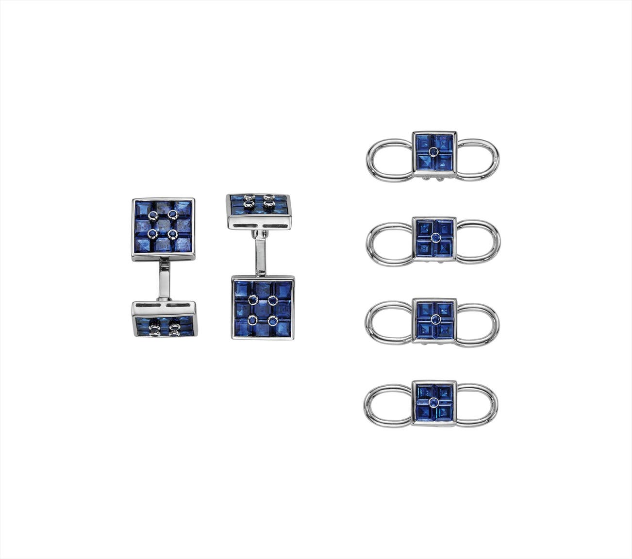 Comprising a pair of cufflinks, each designed as a checker-board plaque invisibly-set with square-cut sapphires, enhanced by collet-set circular-cut sapphires, to a similarly designed swivel link, and four shirt studs en suite, mounted in 18K white gold, cufflink length 3/4 inch, shirt stud length 1/4 inch.
