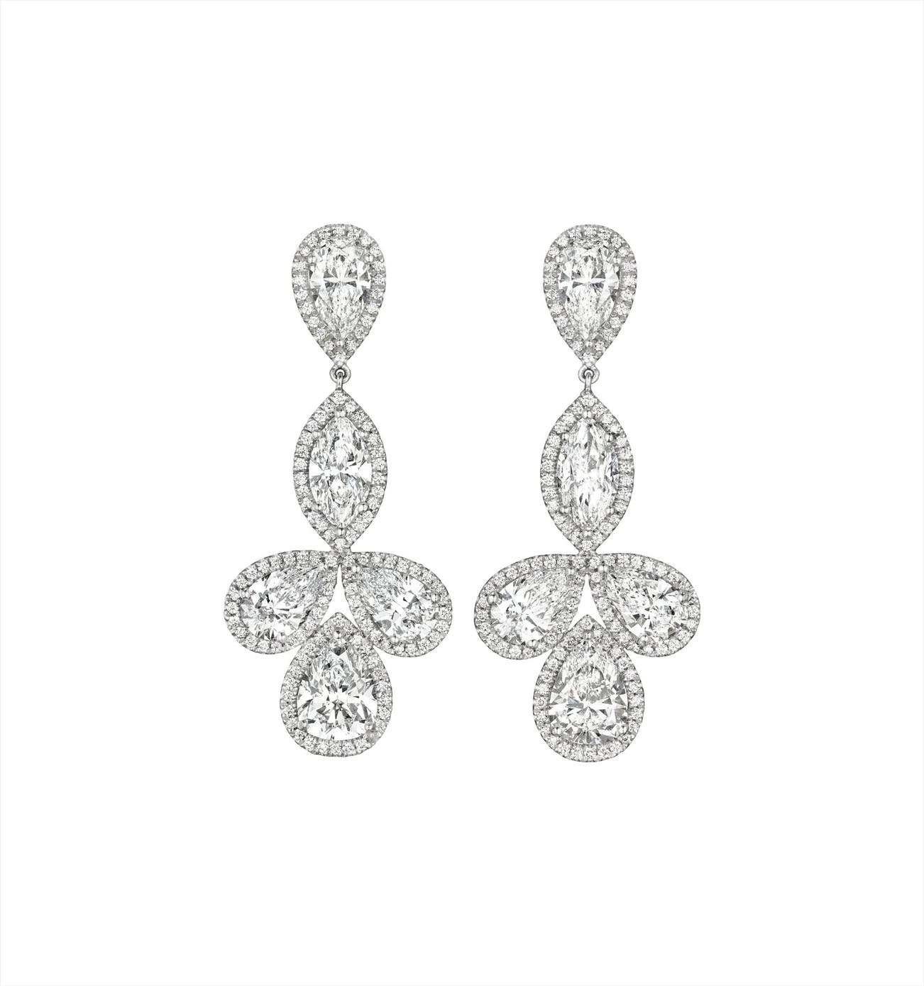 Each pear-shaped diamond surmount, enhanced by a pavé-set diamond surround, suspending a similarly designed arrangement of pear and marquise-cut diamonds, mounted in platinum, length 2 inches.