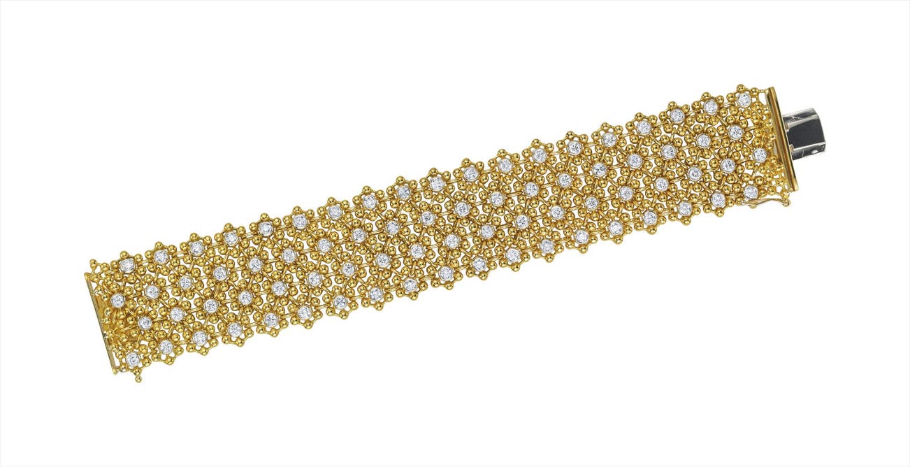 Designed as a highly flexible mesh bracelet, accented by collet-set circular-cut diamonds, mounted in 18K yellow and white gold, length 6 1/2 inches.