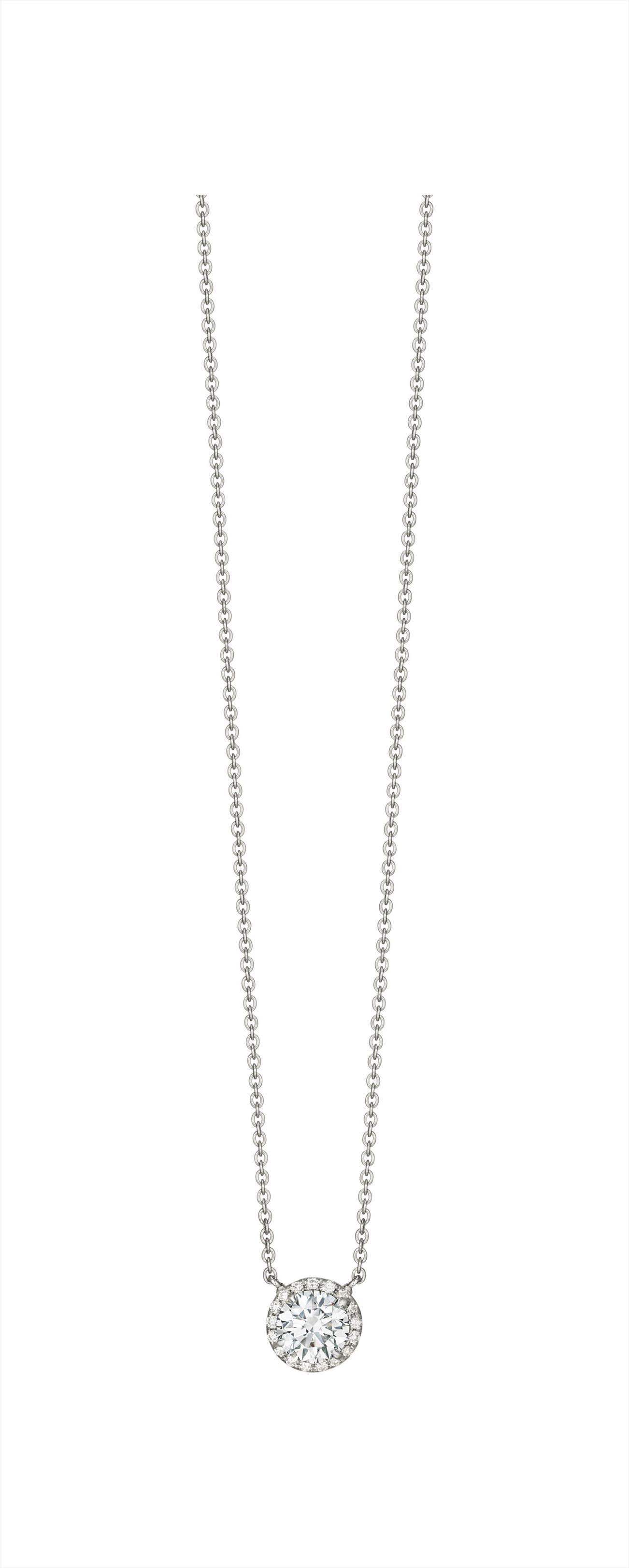 Suspending a circular-cut diamond, weighing approximately 1.67 carats, within a pavé-set diamond surround, from a fine link chain, mounted in platinum, length 18 inches.