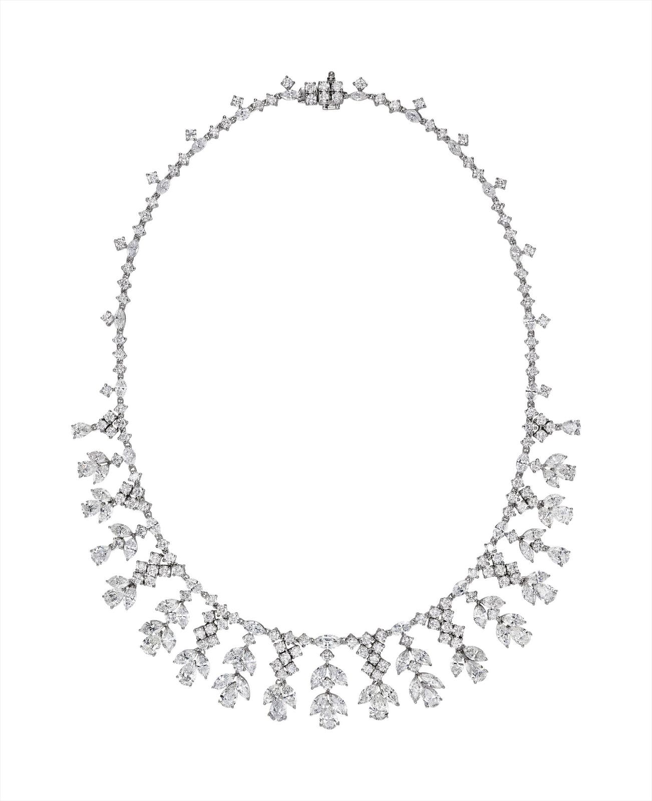 The front designed as a graduated series of pear-shaped, marquise and circular-cut diamond fringes, suspended from a circular and marquise-cut diamond line extending to the clasp, mounted in 18K white gold, length 16 inches.