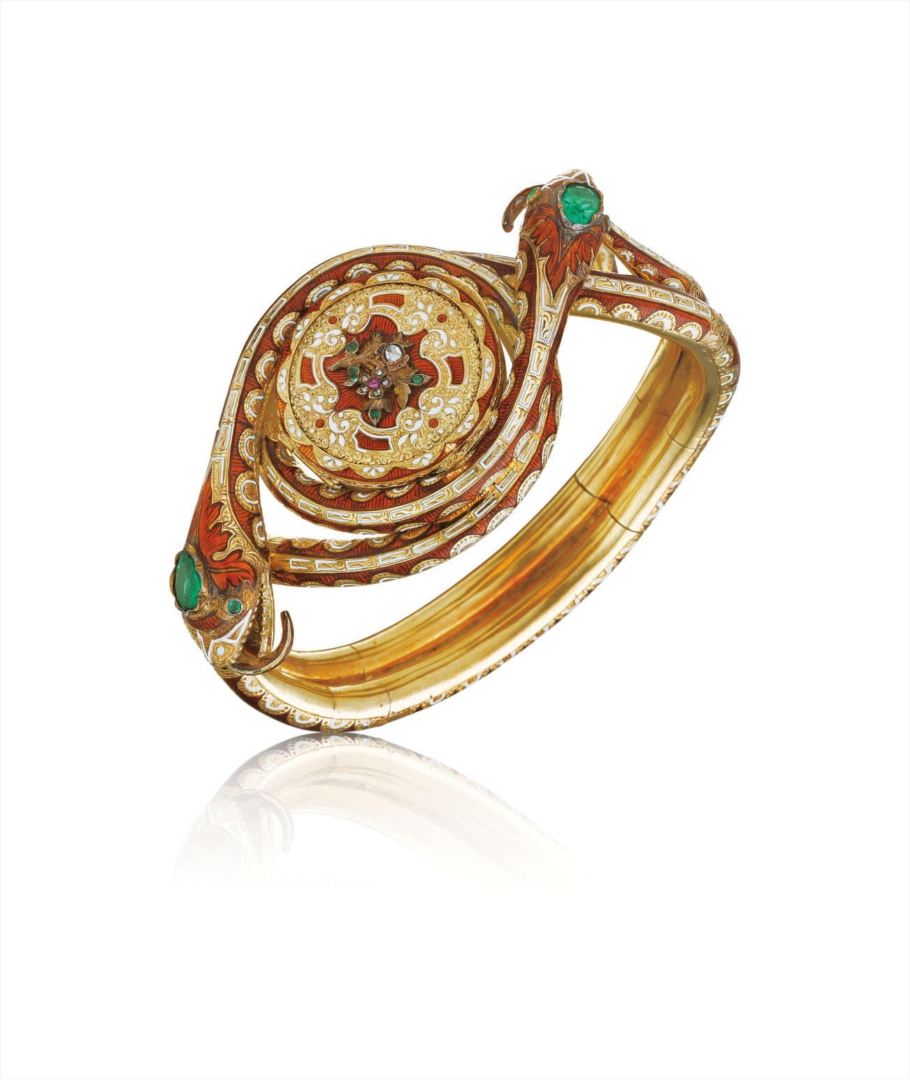 Designed as a gold, red and white enamel snake bracelet of bypass design, accented by circular and pear-shaped emeralds, to the hinged center encasing a watch enhanced by enamel and a multi-gem floral spray motif, mounted in 18K yellow gold, diameter 2 1/4 inches.