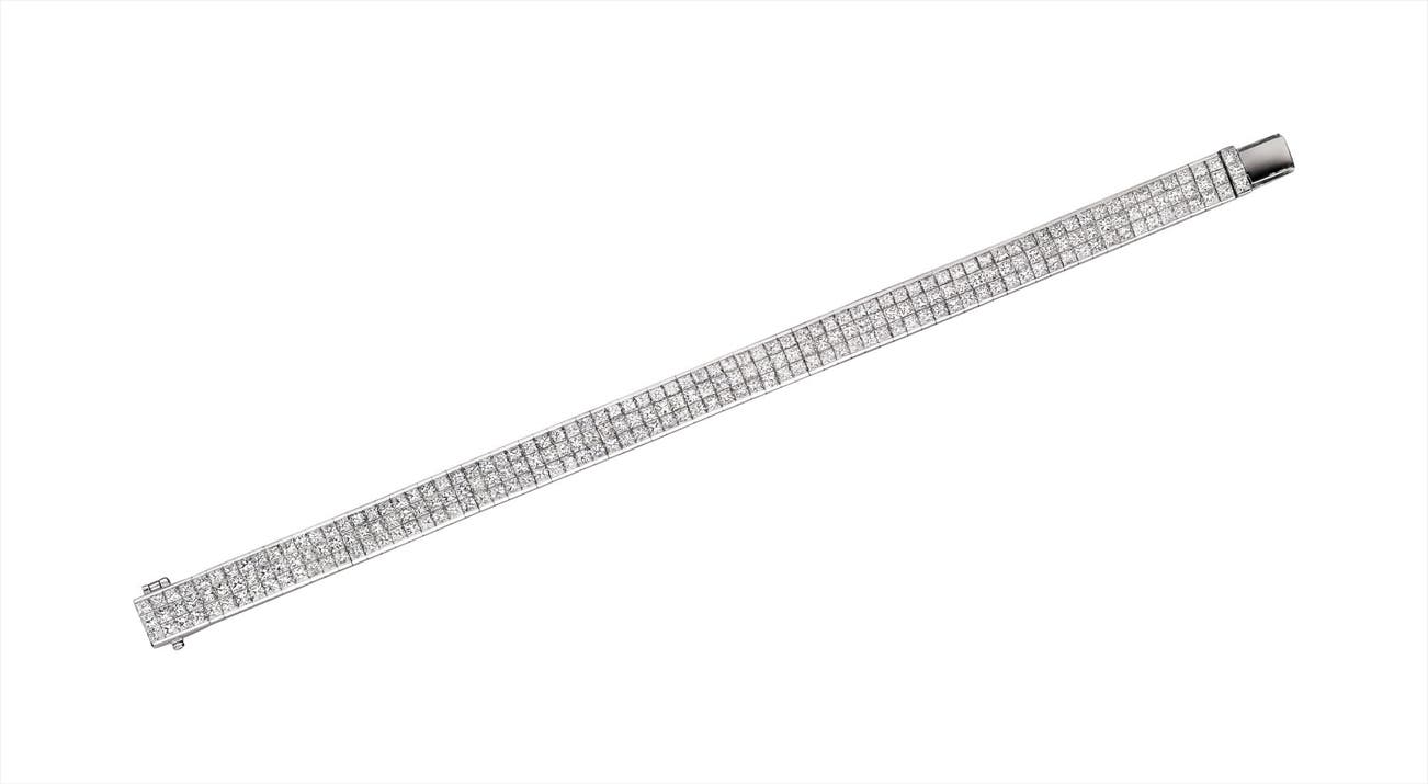 Designed as three rows of invisibly-set square-cut diamonds, mounted in 18K white gold, length 7 inches.