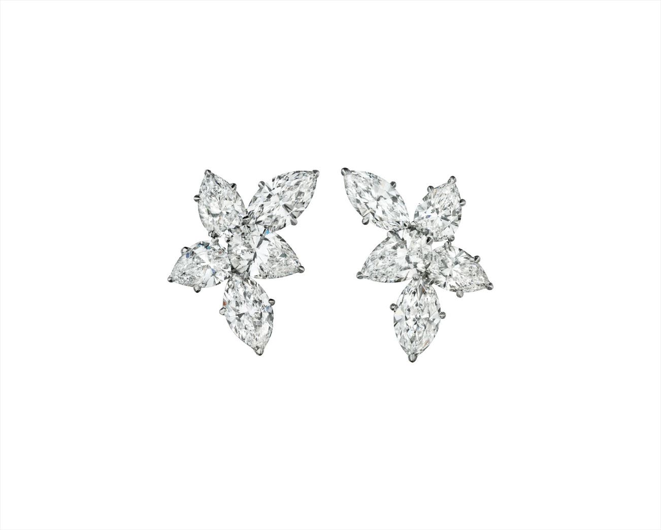 Designed as a foliate cluster of pear and marquise-cut diamonds, mounted in 18K white gold, length 1 inch.
