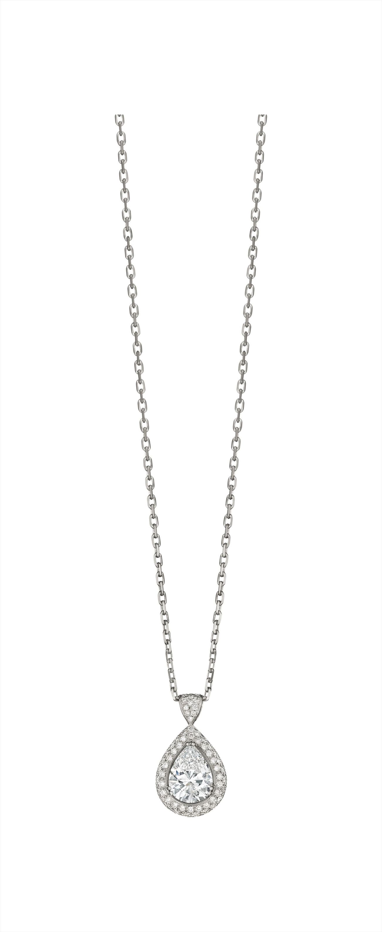 Suspending a pear-shaped diamond, weighing approximately 2.03 carats, within a circular-cut diamond surround, from a fine link chain, mounted in 18K white gold, length 18 inches.