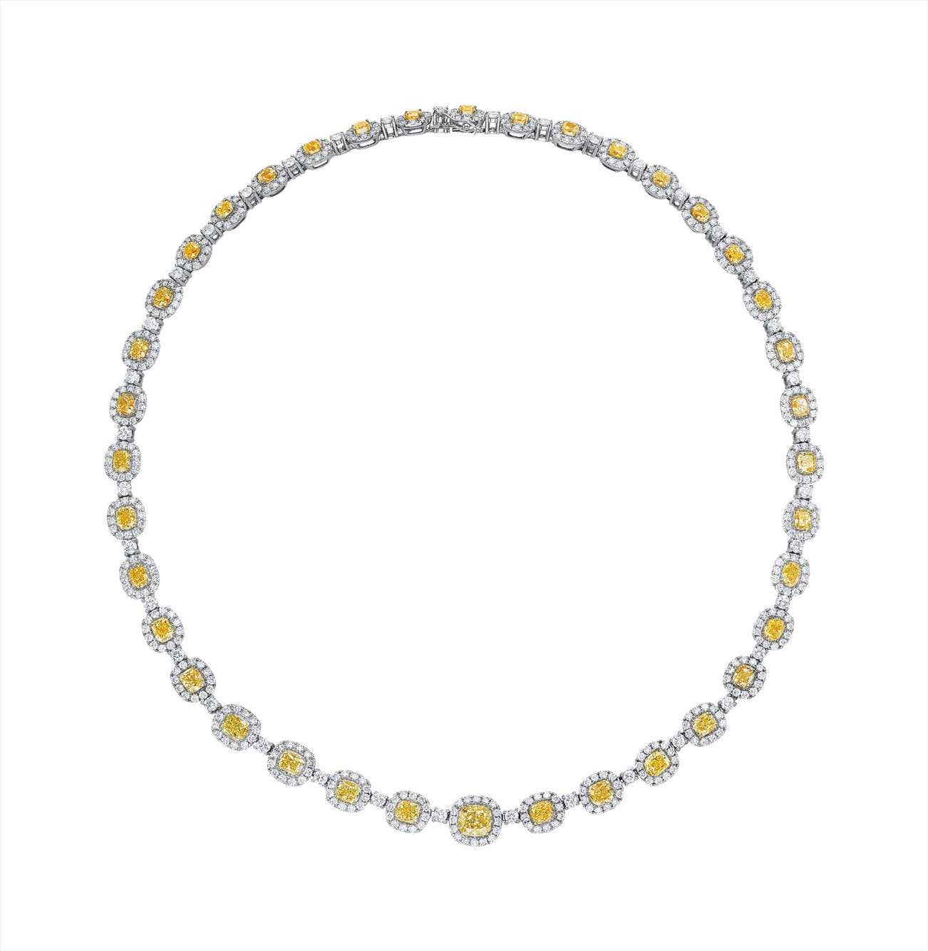 Designed as a line of graduated cushion-cut yellow diamonds, enhanced by circular-cut diamond surrounds, interspersed by circular-cut diamond links, mounted in 18K white and yellow gold, length 17 inches.