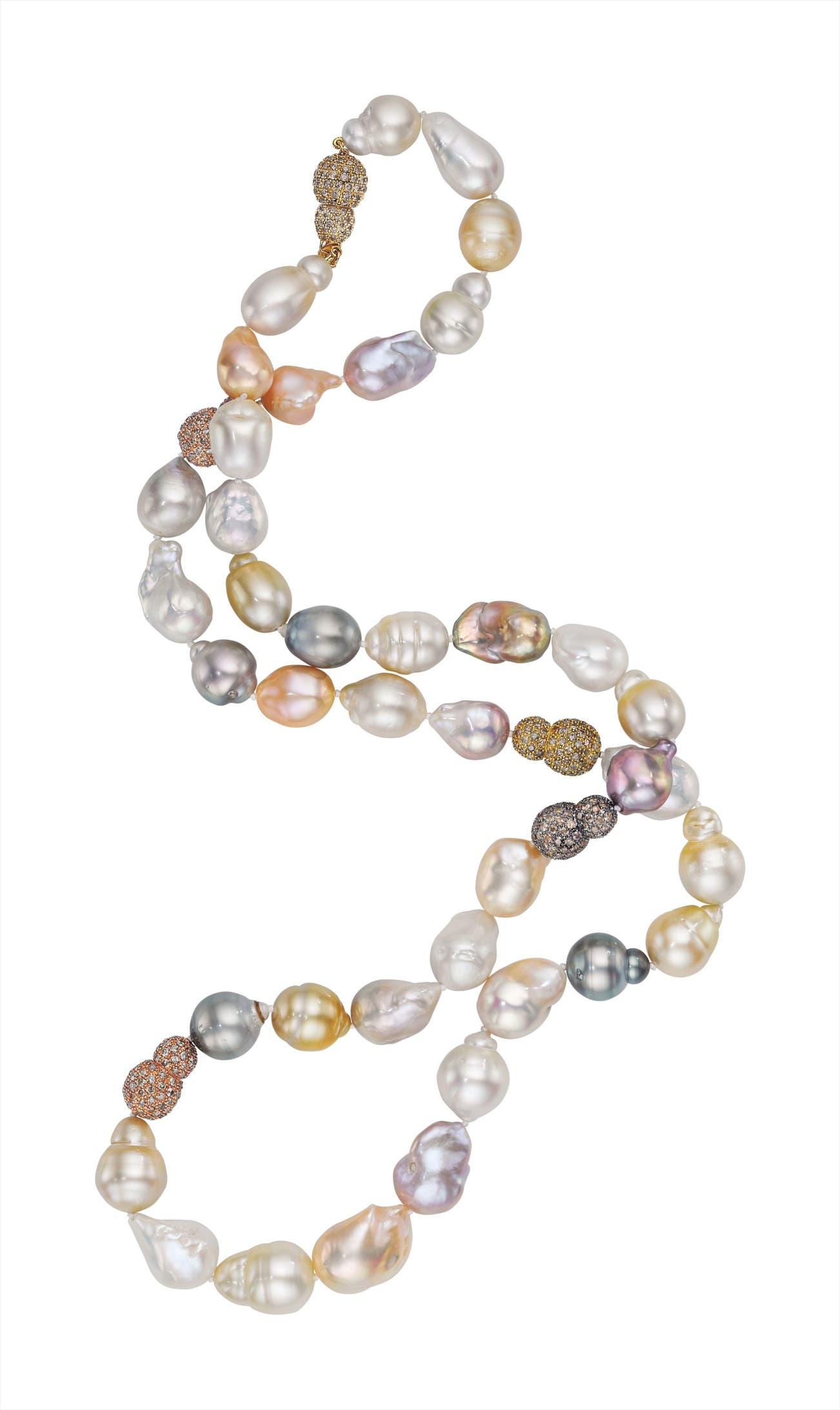 Of thirty-nine South Sea, Tahitian, and Freshwater baroque cultured pearls, measuring from approximately 25.00 to 17.50 mm, accented by circular-cut colored diamond links, mounted in 18K yellow and blackened gold, length 36 inches.