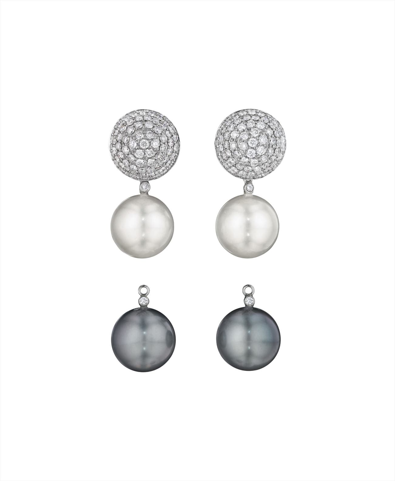 Designed as a bombé circular-cut diamond surmount, suspending a detachable South Sea cultured pearl drop, accented by a collet-set diamond, paired with an interchangeable set of similarly designed Tahitian cultured pearl drops, mounted in 18K white gold, length 1 inch.