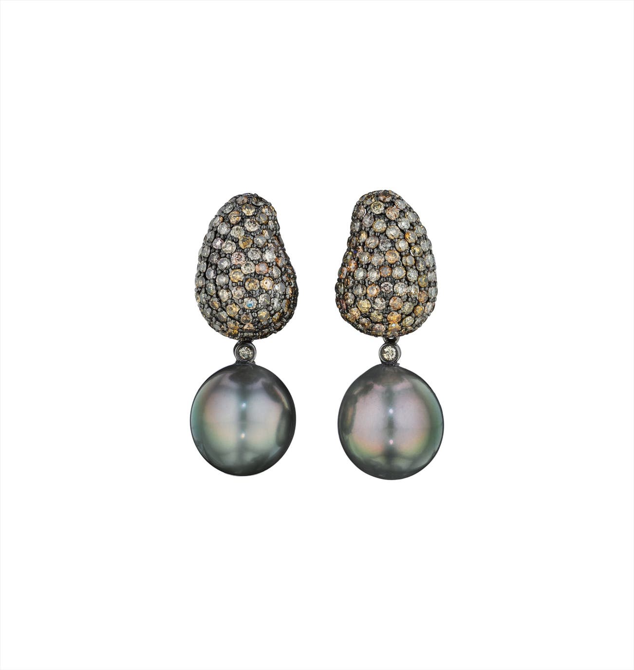 Designed as a bombé circular-cut colored diamond surmount, suspending a detachable Tahitian cultured pearl drop, accented by a collet-set diamond, mounted in 18K blackened gold, length 1 inch.