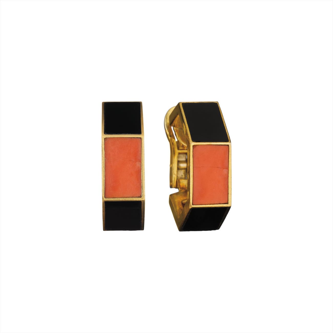 Each designed as a hoop of alternating onyx and coral plaques, mounted in 18K yellow gold, length 1 inch.