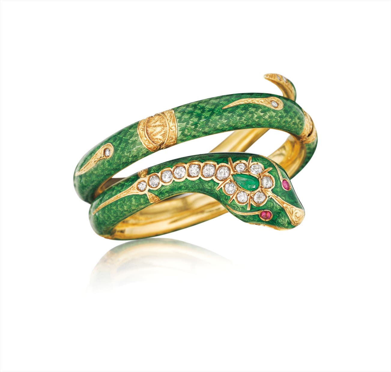 The flexible hinged bracelet designed as a green enamel coiled serpent, accented by engraved gold detail and rose-cut diamonds, to the old-cut diamond and pear-shaped emerald head and ruby eyes, mounted in 18K yellow gold, diameter 2 inches.
