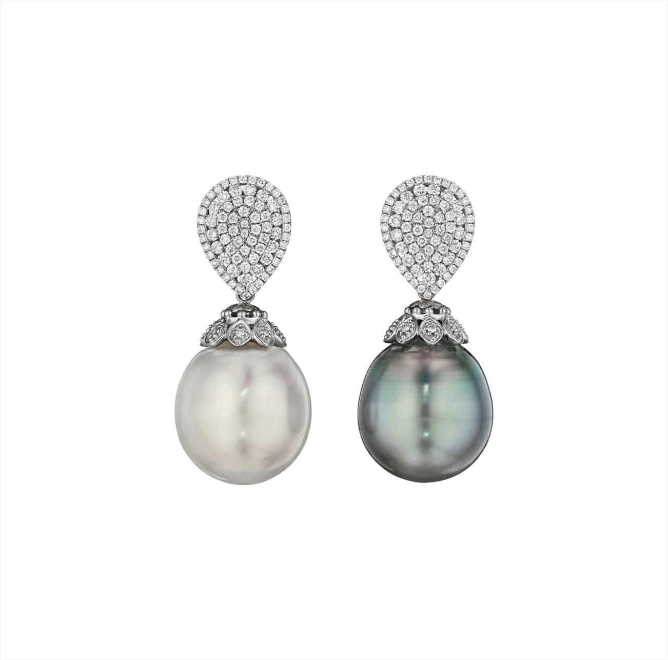 Each suspending a Tahitian or South Sea pearl from a circular-cut diamond cap, to the pear-shaped surmount entirely set with circular-cut diamonds, mounted in 18K white gold, length 1 1/3 inch, pendant is detachable.